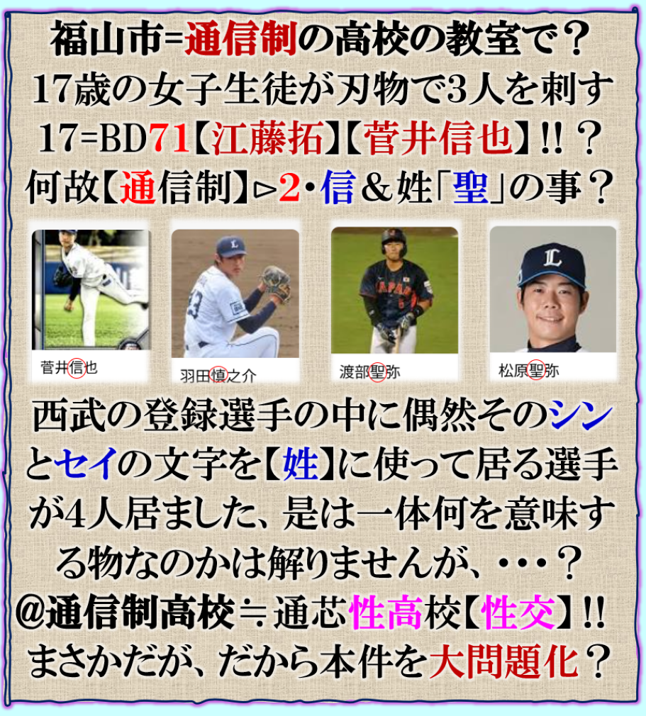 西武球団の裏側では何か異様な事が起きて居ると言う「示唆」では無いか❓組織的な【JK】裏ビジネス❓まさかだが、闇が深そうに思える、その問題に関わる【通信制の高校の】「のの」とBD917が係わる問題だと読めるのだが、山梨【リニア】で狼煙が揚がった事件と無関係では無い【梨ニア―⊳Near】その近くで「周辺」で何かが行われて居る、甲府市の「スナック」【さき】から【狼煙】が揚がって居た事とも無関係では無い訳です。 sy