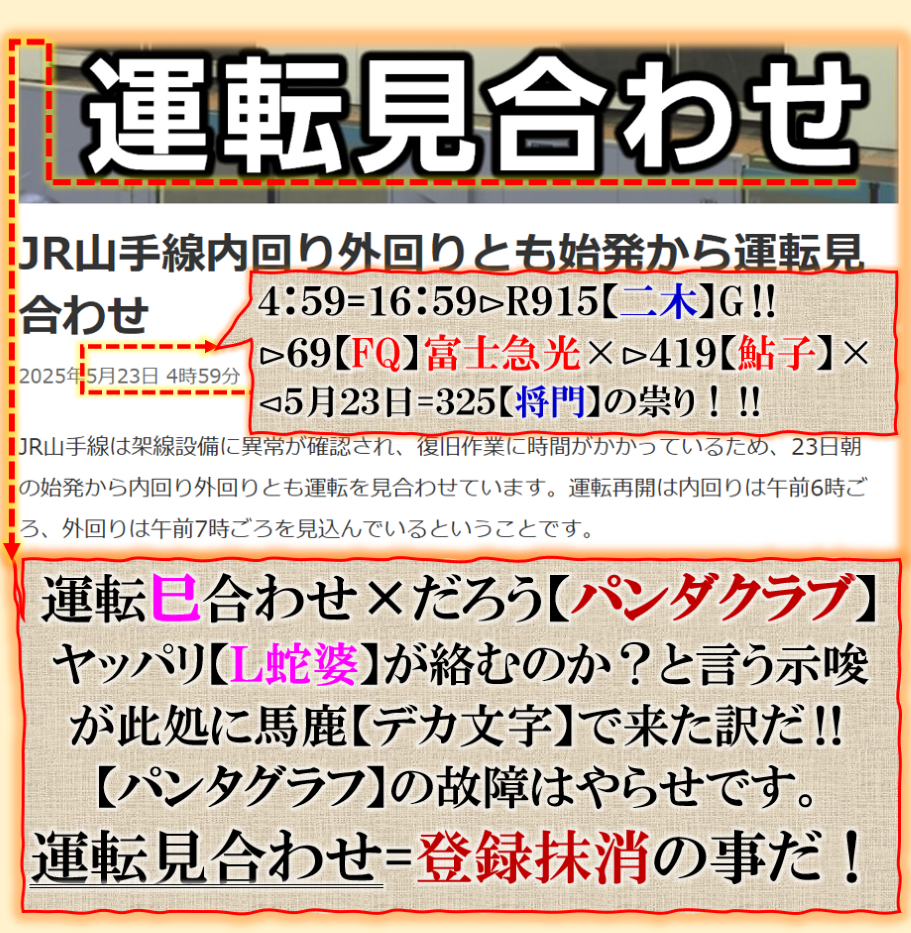 普通では無い事が起きて居る、【矢魔の手】戦=【イカ様野球】の話では無いか❓【魔の手】は何処から出て来るのか❓【蛇】からなのかも知れません、執念深い【蛇】は電柱の上に巣を造った【鳥の卵】を狙って【電柱】を登る話は事前に出して居た、その結果で今回の大事件へ発展させて来た、物語には「起承転結」が或るのです、此処は【転】なのです、見出しに大きく書いてある事を見逃すな!!!‼【運転見合わせ】其処迄【暗号化】仕込みにしてある事に気付きなさい。 sy
