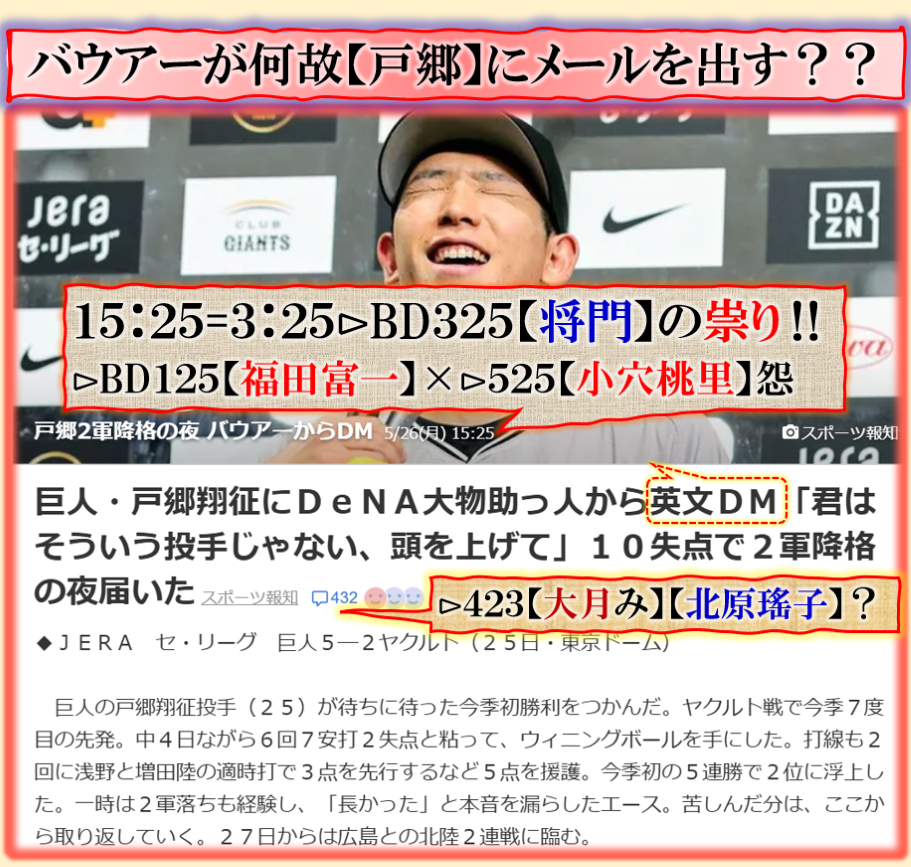主役は【野球】なのです、是は【祟り】だと思いますが、余りにも出来過ぎで恐ろしい、!‼⊳【彩咲陽】あさひさん事件は双方で【NY野球帽】着用‼あり得ねえ、【あさひ】さんの焼き残り残骸は【ボストン】バッグにいれて床下収納、【レッドソックス】も出て来た‼⊳昨日の昼かその前子供の日に【山梨】の何処かで【少年野球】のあいさつに出て来た【見返らないL蛇婆】❓それに同期して「巨人」の【岡本和真】左肘故障で登録抹消???遣り過ぎなのだが、実は是が全部【祟り】で起きて居る事が解ります、何処までも遣られます、その背景に【咲】さん二人分の「怨念」が渦巻いている訳です、【小倉美咲】&【岡崎彩咲陽】の喰われた被害者の怨念は収まる訳が無い、その【祟り】が野球界に出て来た、大袈裟な解釈だと思うのは自由だが、【祟り】の恐ろしさを知らない皆様には通じない話かも知れ無いが是は間違いなく「それ」だから、~~~♬ sy