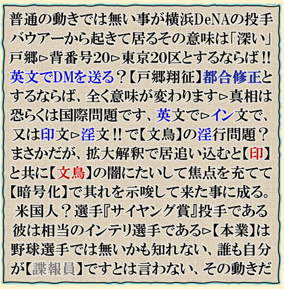 私的理解ですが、彼こそが「球界」の「JB」であると前から考えて来た、その彼が動いた訳ですから、是は只事ではあり得ません、問題は何を意味しているのか❓簡単に推理して見た結果が是なのだが、是だけではありません、これ以外にもあるのですが、此処では語れません、黙します。 sy
