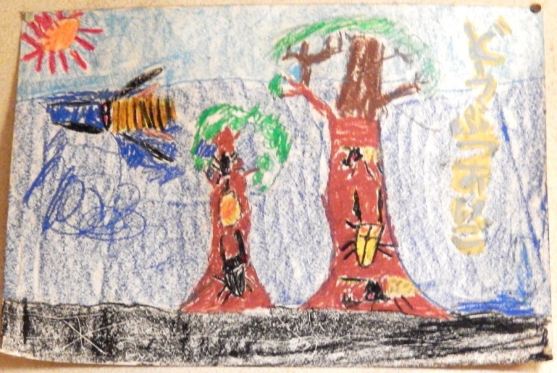 上野村の小学生が絵がいた、【あの日】の絵なのです、題名は驚きます【どうぶつあいご】だと言うのです、上野村の静かな日常を襲った爆音が村人ををも驚かせた事が良く解ります、大きな木に留まっている【小動物=昆虫】達も驚いている事が描かれて居るのです、実にリアルで驚きます、静かな村の上空で是は【皮肉】な絵である、余りにも異様な【皮肉】的な凄い絵を残してくれました【永久保存版】ですので、良くご覧下さい。 今は一般公開されて居ませんので他では見る事が出来ません、毎年この時期に【私】だけが公開して居ます。 sy