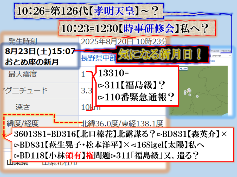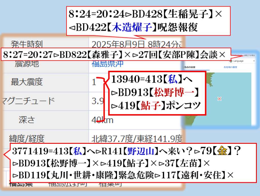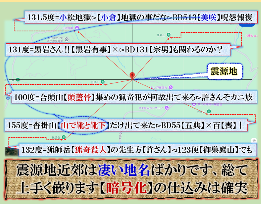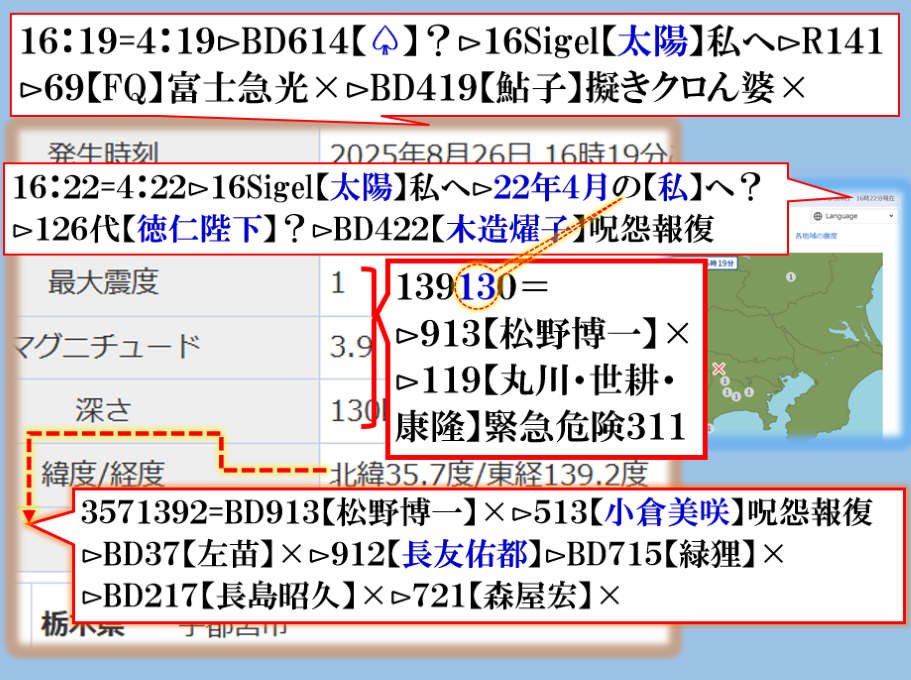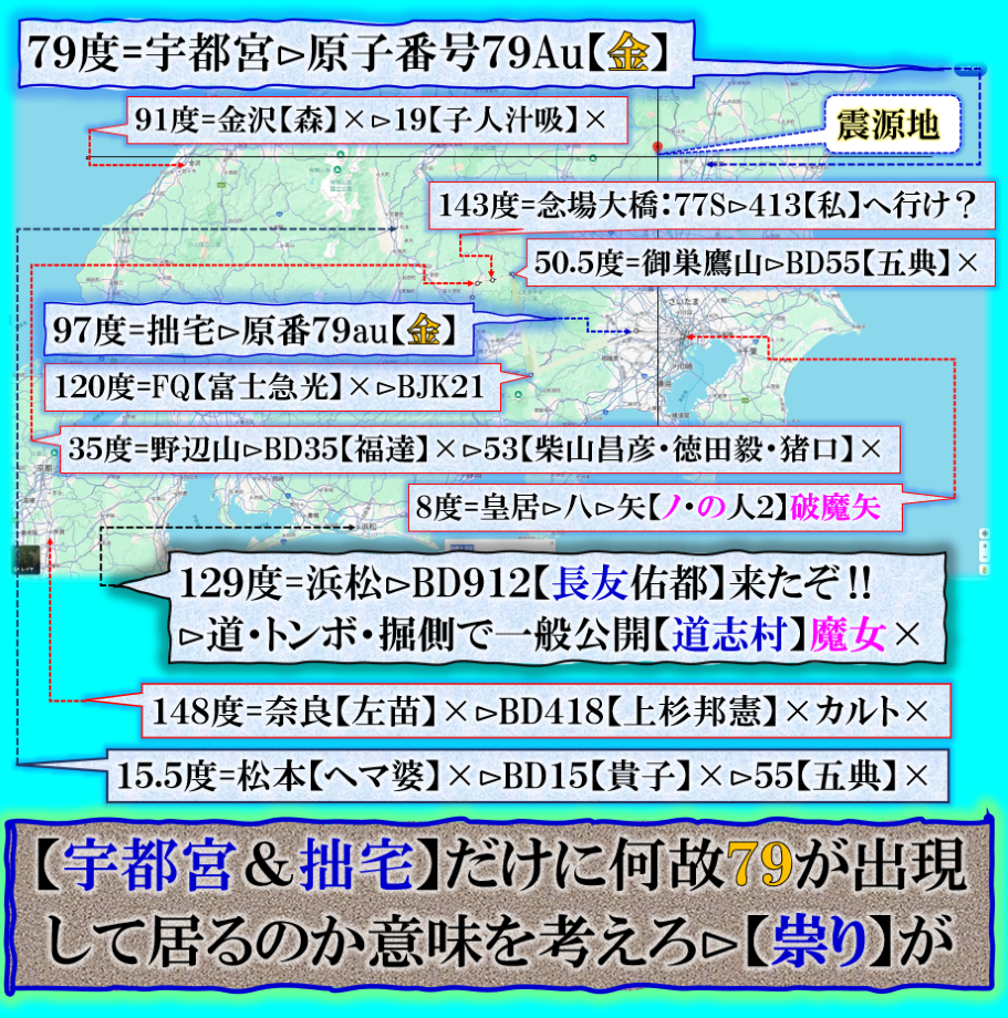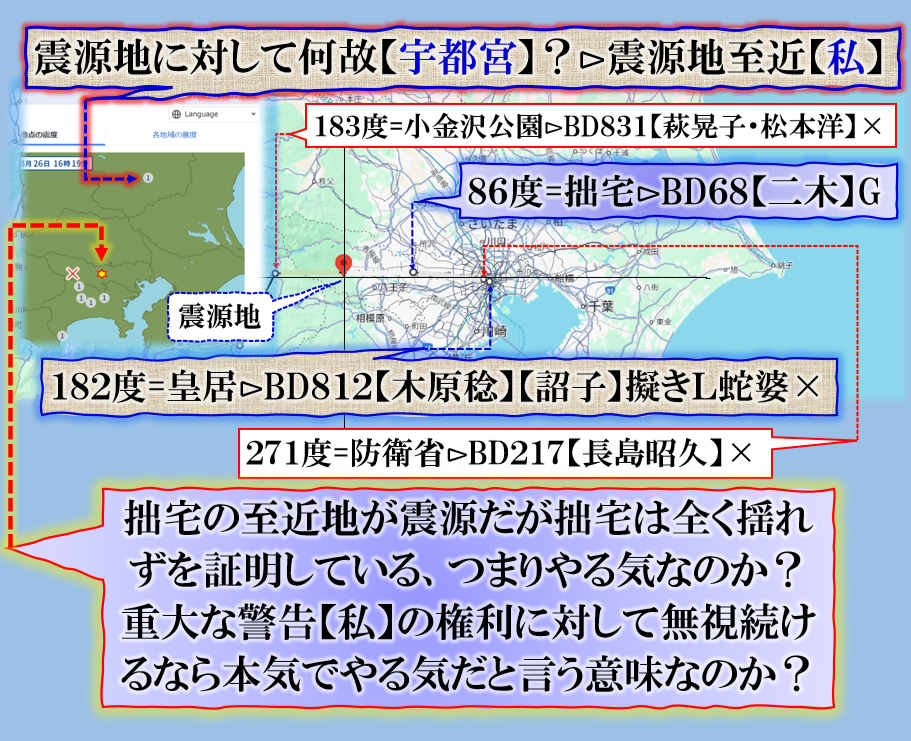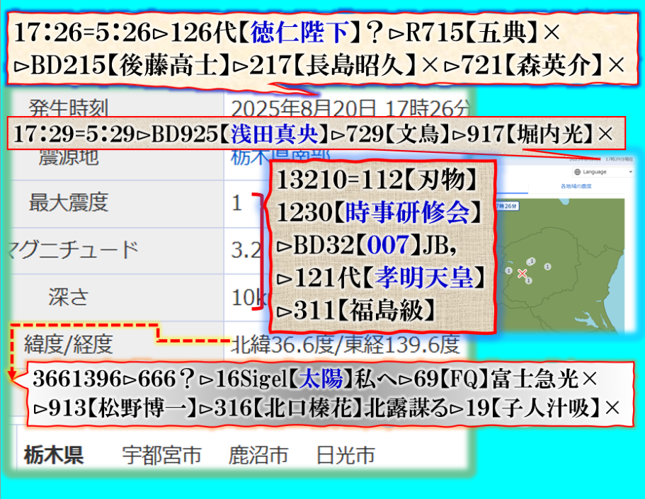 震源地が【鹿沼市】付近‼是だけでも見過ごせません、思い出して下さい知床の【羅臼岳】で熊に遣られた事件が連動して居る、【ラウスダケ】=【うすら*だけ】=*「馬鹿」⊳うすら馬鹿だけ、がはびこる永田町とその【闇】勢力に対して【作戦行動】が動き出して居る事を【広告】して来た訳です。819の地震は函館【大沼公園】近郊でした、此処で次は【沼】だと言うサイン⊳翌日20日に【鹿沼近郊】で地震です、完全に【沼】で連動してきました、何故【沼】なのか❓⊳【羅臼岳】の「うすら馬鹿だけ」の馬鹿⊳「鹿」を出す為に【鹿沼】だった訳です。その「おバカ」だけの自民党『旧安部派』の動きに牽制して居る、国際的に見て最も真面な政治をして居る【石破】を蹴落として【裏金議員】やそのセクトの新顔を【首相】に揚げて権力復権を狙う【うすら馬鹿だけ】のお馬鹿セクト等に対して【警告】である、同時に何故【私&宇都宮】に【金】の表示が出て来たのか❓その意味を理解しないととんでもない【祟り】が見舞われる事を【示唆】してきたのです、覚悟しろよ【私&当家】には【助けが居る】からだ。 sy