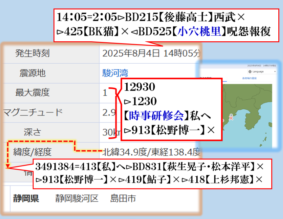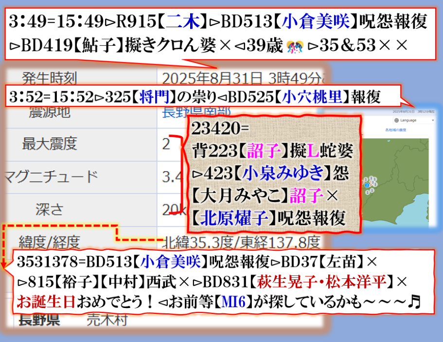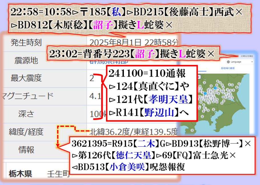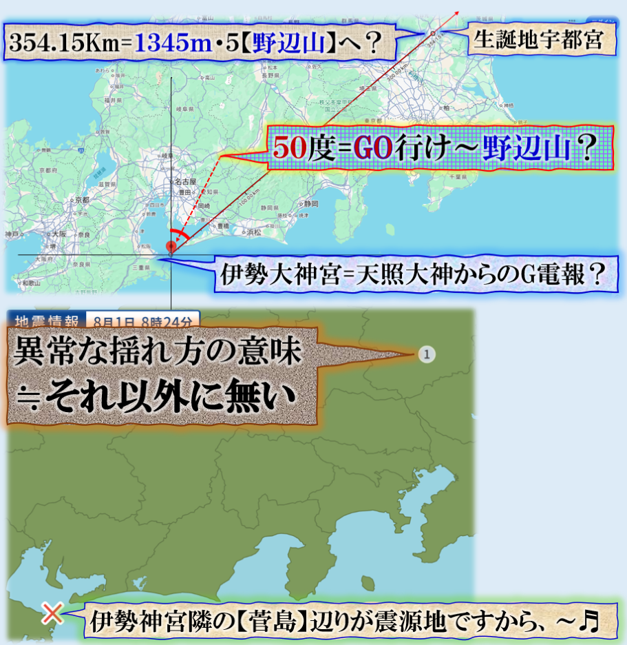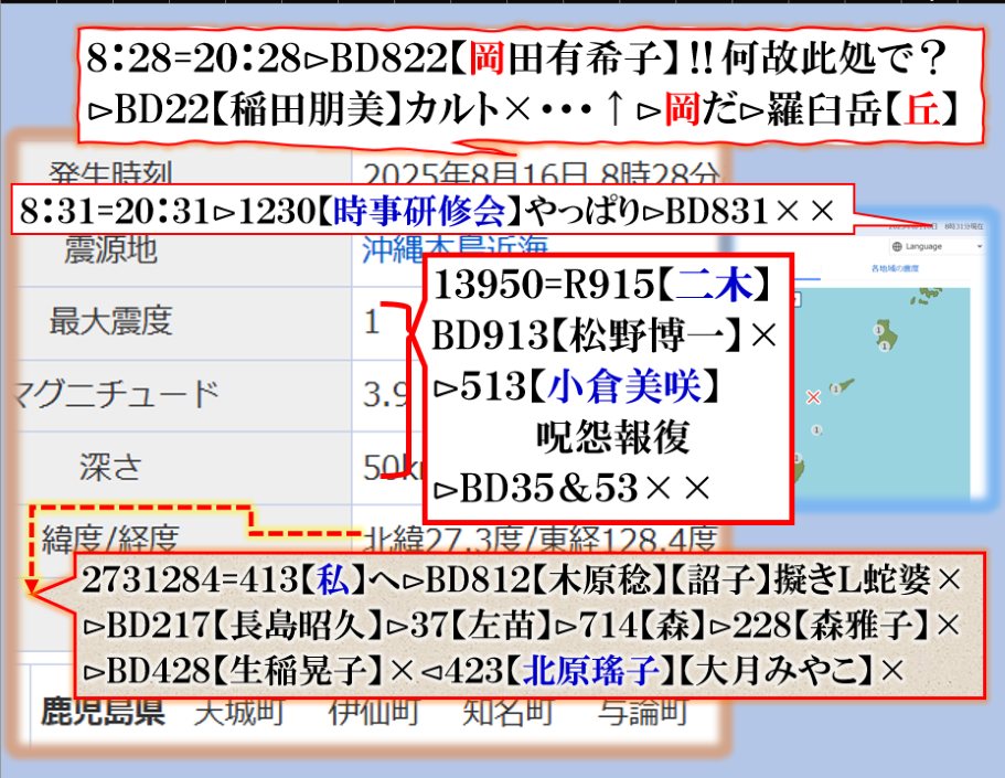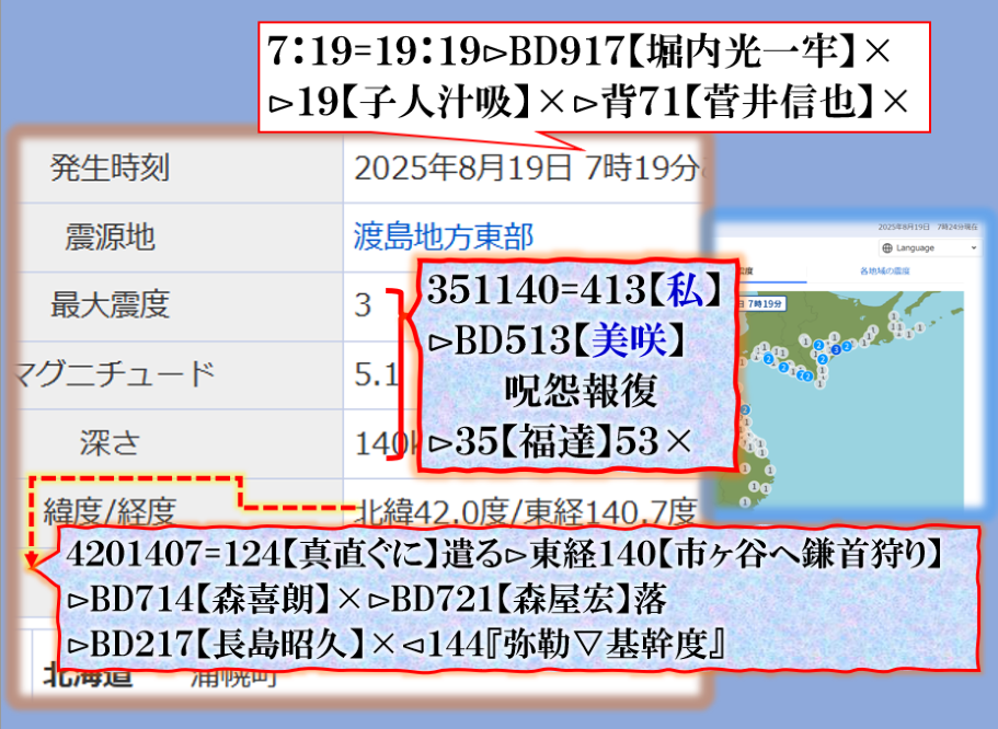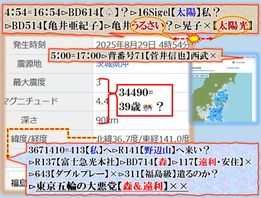 震源地が【鹿沼市】付近‼是だけでも見過ごせません、思い出して下さい知床の【羅臼岳】で熊に遣られた事件が連動して居る、【ラウスダケ】=【うすら*だけ】=*「馬鹿」⊳うすら馬鹿だけ、がはびこる永田町とその【闇】勢力に対して【作戦行動】が動き出して居る事を【広告】して来た訳です。819の地震は函館【大沼公園】近郊でした、此処で次は【沼】だと言うサイン⊳翌日20日に【鹿沼近郊】で地震です、完全に【沼】で連動してきました、何故【沼】なのか❓⊳【羅臼岳】の「うすら馬鹿だけ」の馬鹿⊳「鹿」を出す為に【鹿沼】だった訳です。その「おバカ」だけの自民党『旧安部派』の動きに牽制して居る、国際的に見て最も真面な政治をして居る【石破】を蹴落として【裏金議員】やそのセクトの新顔を【首相】に揚げて権力復権を狙う【うすら馬鹿だけ】のお馬鹿セクト等に対して【警告】である、同時に何故【私&宇都宮】に【金】の表示が出て来たのか❓その意味を理解しないととんでもない【祟り】が見舞われる事を【示唆】してきたのです、覚悟しろよ【私&当家】には【助けが居る】からだ。 sy