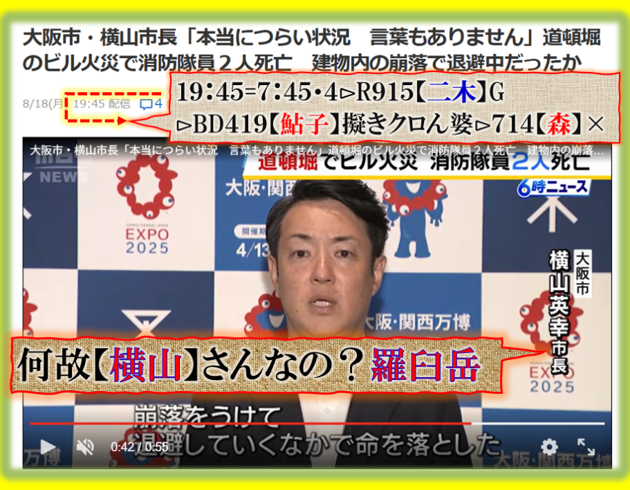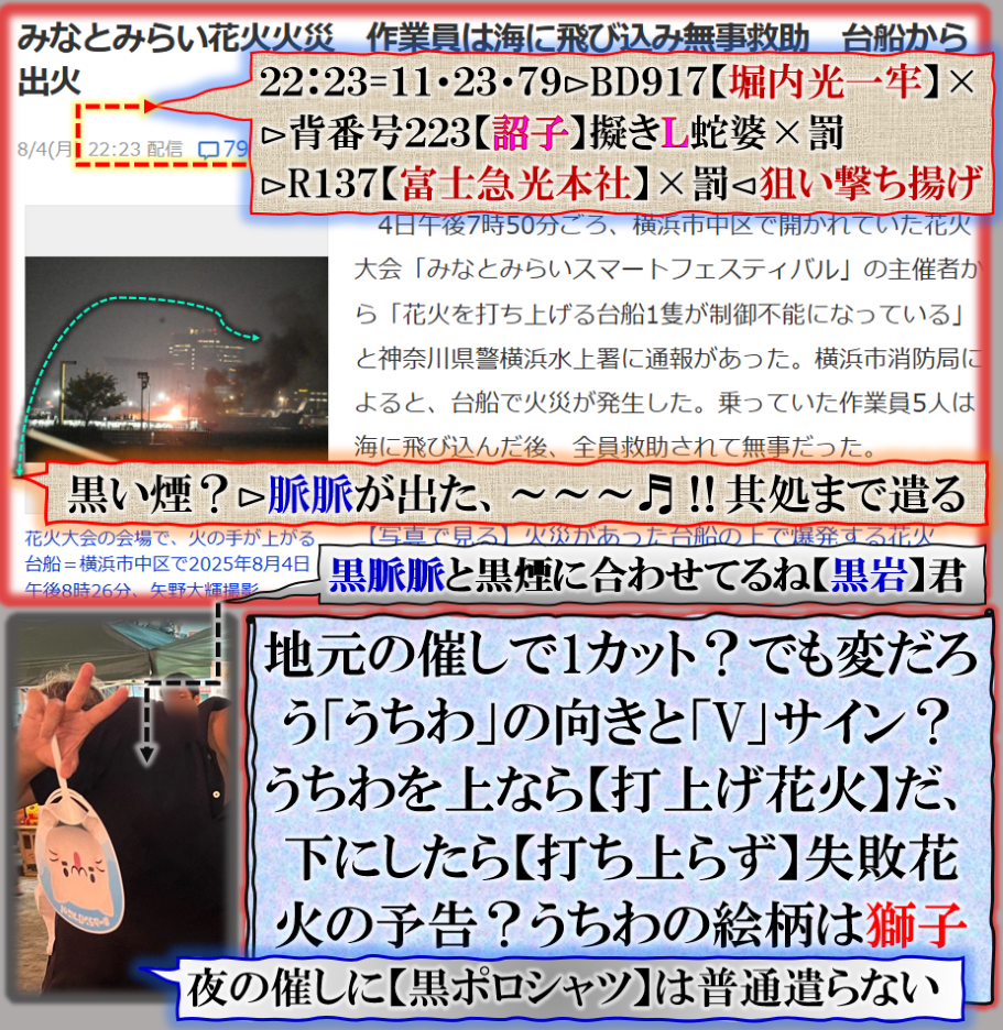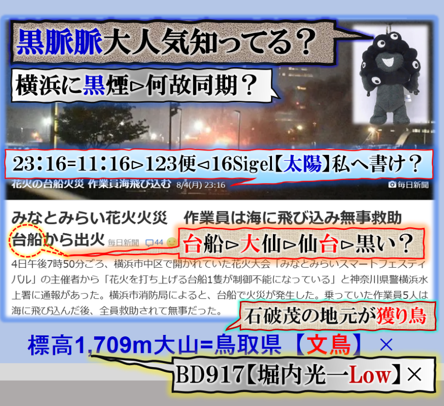 【黒い霧】の季節?⊳黒い煙の話しです、大阪万博の【ミャクミャク】【脈脈】の黒色版が大人気だと言うTV,放映を出しておいて、同時に【黒い煙】だと出して来た、その前に【黒ポロシャツ】の人も出て来た!!!!⊳全部焦点が合って居る訳です、横浜港未来で【花火大会】西武の本拠地が「池袋」なら第二のアジト【横浜】でこの仕込みが行われて本当に実行された意味を考えなくてはいけません、【台船】から出火????⊳「台湾」の船に何か起きるのか❓⊳仙台で何か❓⊳大仙だと「秋田」の【菅黒君】もヤバそうだが、もっとヤバいのは【大山】鳥取にある山ですが、鳥を捕る山で❓何鳥【文鳥】の事だろう、何処で捕る気❓⊳【大山】神奈川県にもその名の山が有ります、今回は山では無く神奈川県の【海】で【焼き鳥】を狙ったのか❓と言う推測も出来る、普通に考えても今回の事故は変だろう、主題は「黒い煙」である。花火は撃ち揚げる物、下へ向かって爆発させたらダメだろう、巨大な逆爆発は許されません【旧安部派】のお馬鹿政治屋さん等に警告の「花火大会」にすり替えた訳です。凄い事が起きて居る事実を理解しなさい。 sy