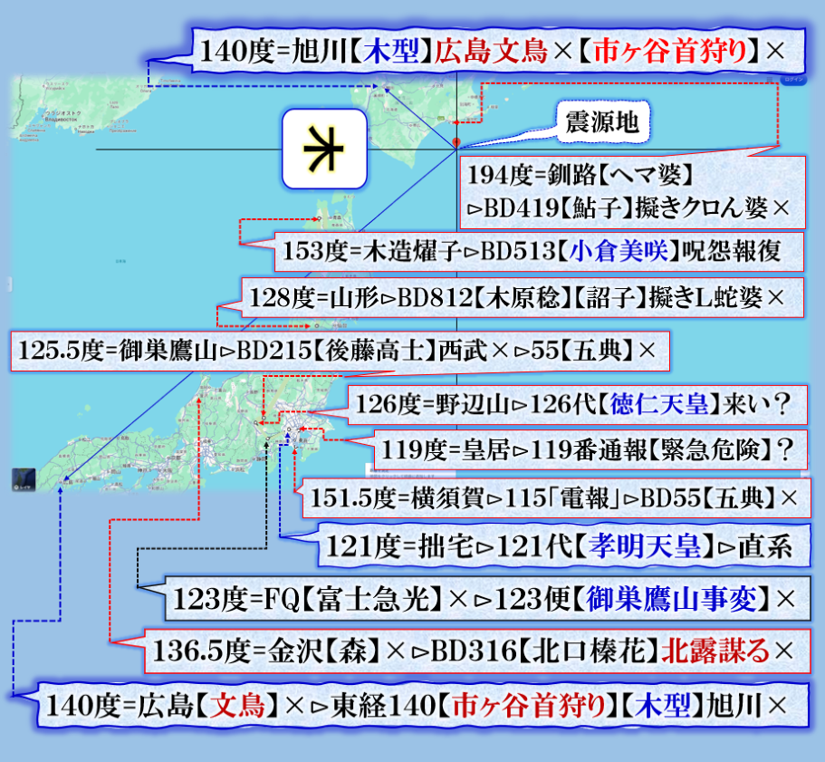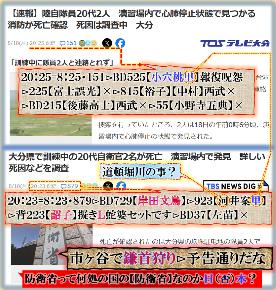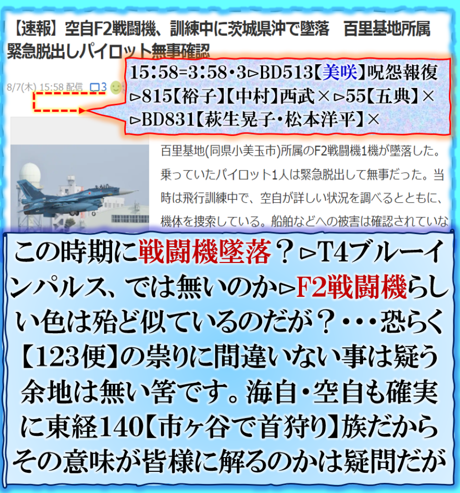 F2戦闘機「百里基地」から出た当機が最近茨城県沖で墜落した、更にその前は「小牧基地」から飛び立ったT4「戦闘機」が間もなく墜落した、定期的に発生する【防衛省】関連事故は何故起きる???其処が狙われて居るからです、何処の誰に【何故】❓・・・その前に言わなければ成らない事=東経140度は【鎌ヶ谷市】=市ヶ谷に鎌=市ヶ谷【防衛省】に鎌【首狩り】=鎌首の意味であり其れは【蛇】の鎌首を狩ると言う意味につながる訳ですが、だとすると意味が合う訳です、【道頓堀川】で狼煙=道志村の【トンボ】は堀側であり、【トンボ】をシンボルとして公言して居る人は【蛇歳】の人であり【掘*】のの人です、いよいよ【本丸】へ侵攻して来た事が読み取れるのです。一般には恐らくだが通じないお話かも知れませんが。 sy