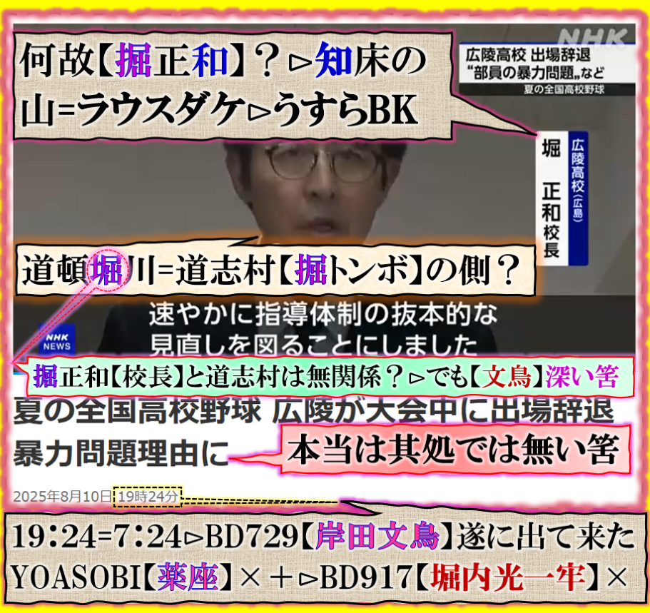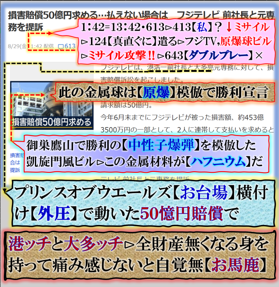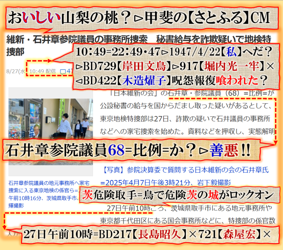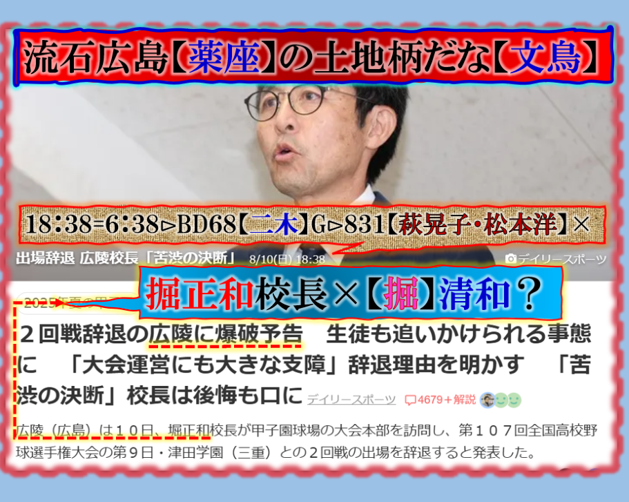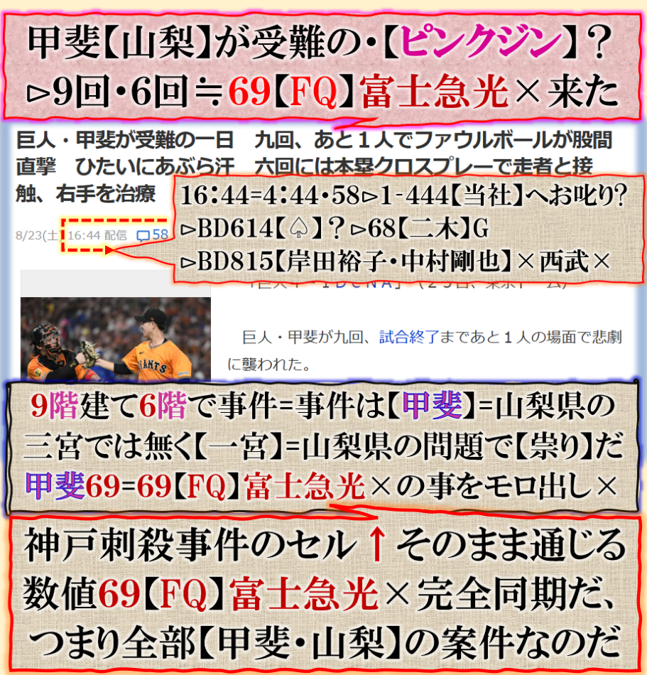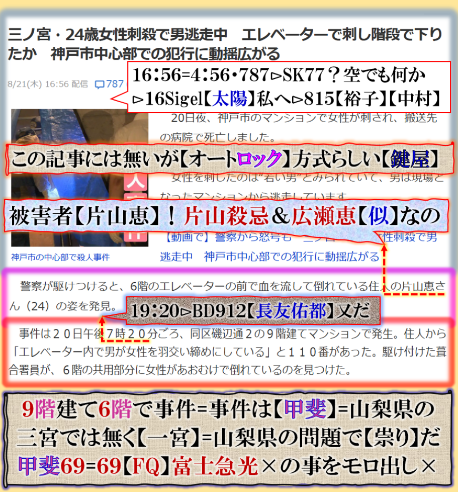 何故9階6階が出て来るのか偶然はあり得ません、其処から変です、階=甲斐=山梨県の事なら三ノ宮では無くて甲斐【一宮御坂】辺りの問題なのです≒【堀内詔子】の問題に決定です、其処に【長友佑都】が出て来る意味は、堀内と【道志村・トンボ・掘り川】側の問題だと決定です。相当狙われて居る事が良く読み寄れるのです、その裏側に居るのが【広島薬座】である、英国空母打撃軍【プリンスオブウエールズ】は月末に向けて【横須賀】から【東京湾】へ入港するらしいぞ、是で【永田町】の【猿蛮族】追い込まれる事に成りそうだ、BD831「萩生晃子・松本洋平・森英介」既にロックオンされて居るのかも知れません、明日の【皆既月食】はその不吉の前兆???其処へ目掛けて【作戦行動】を仕込んで来たのかもしれません、闘いは熾烈だ、毎日が【戦闘状態】である今の【日本国】の実態を国民は知る必要があるのです。裏金議員は即【死刑】である、総裁選へ出て来る事等世界の常識からは考えられない【蛮行行為】である事が全く自覚できない【旧安部派】の猿蛮族に明日は無い、同時に【自民党】も終わった、新生【自民党】に替わる動きが、実を結ぶのか❓否か❓?❓【天下分け目の秋】に成る。 sy