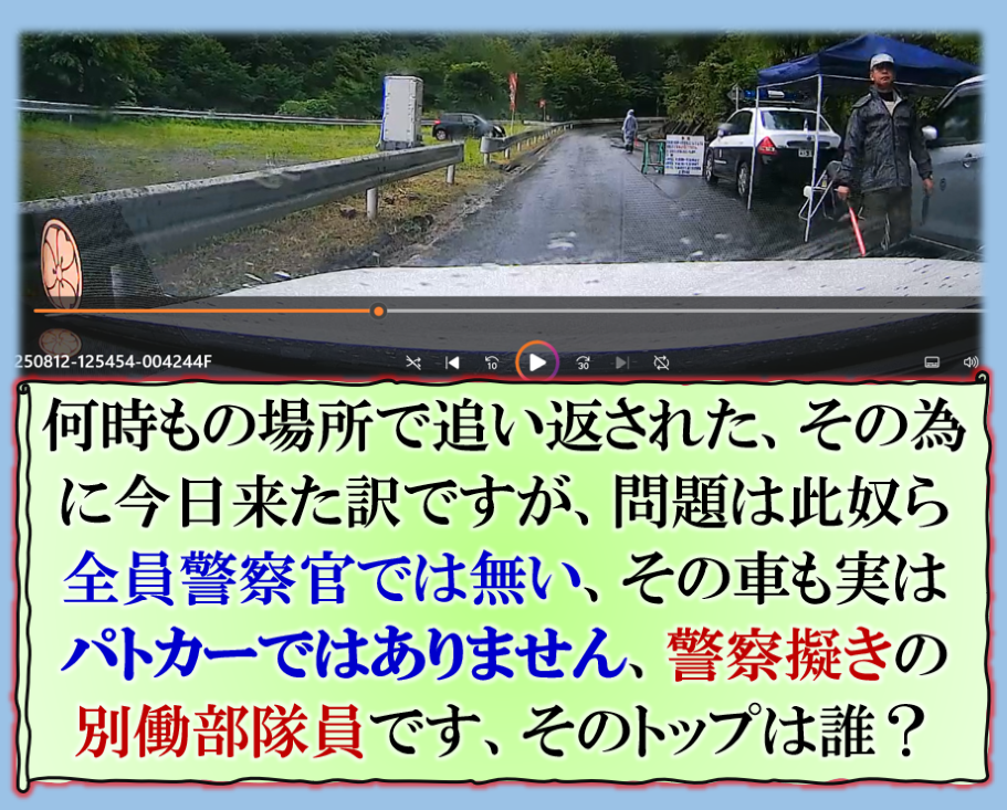 実は此処で追い返される事を目的として、来た訳ですから、是で良いのですが、その車は本当に【パトカー】では無いのです、日本国の【闇組織】の管轄なのでしょう、気分が悪い奴等です。   sy