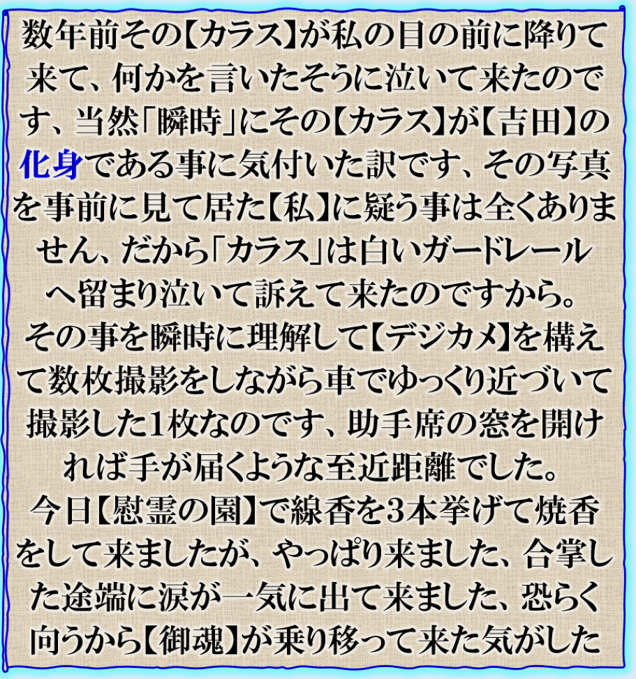 この世界の話は一般人には通じません、その場で【自身】で経験しなければ理解は出来なくて当たり前だと思いますが、実に【不思議】な時間帯でした、朝9時に家を出発して、帰宅したのは5時少し前でした、全行程を一般道路を走る訳ですから、距離は余りありませんが、時間はかかりますので、足が遠のく訳です。今日は特別な日だから、朝から行く事に決めてやっぱり【奇跡】が起きたのです。 sy