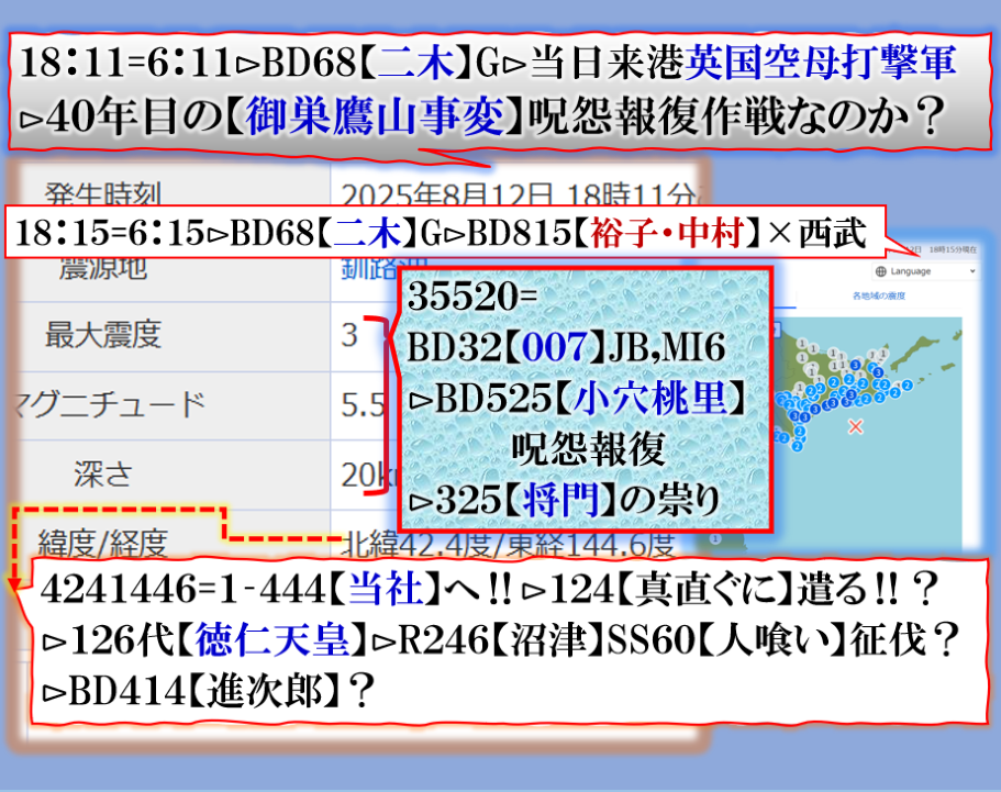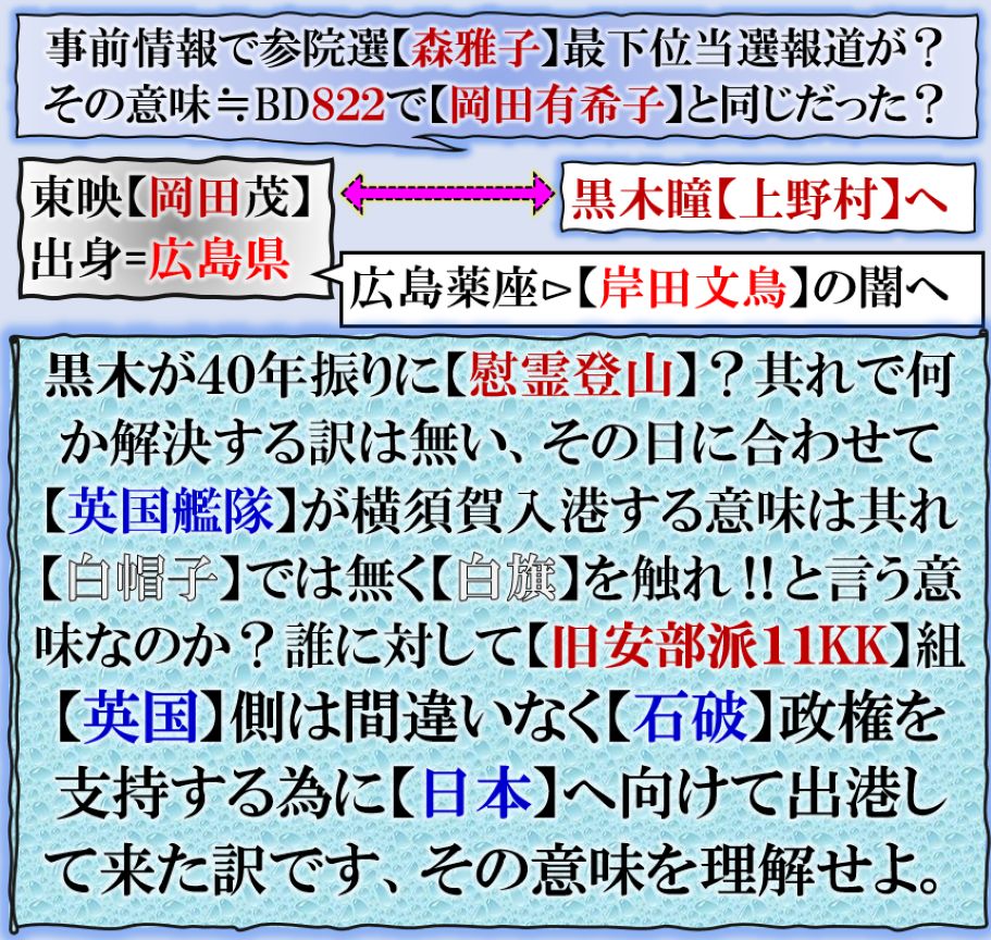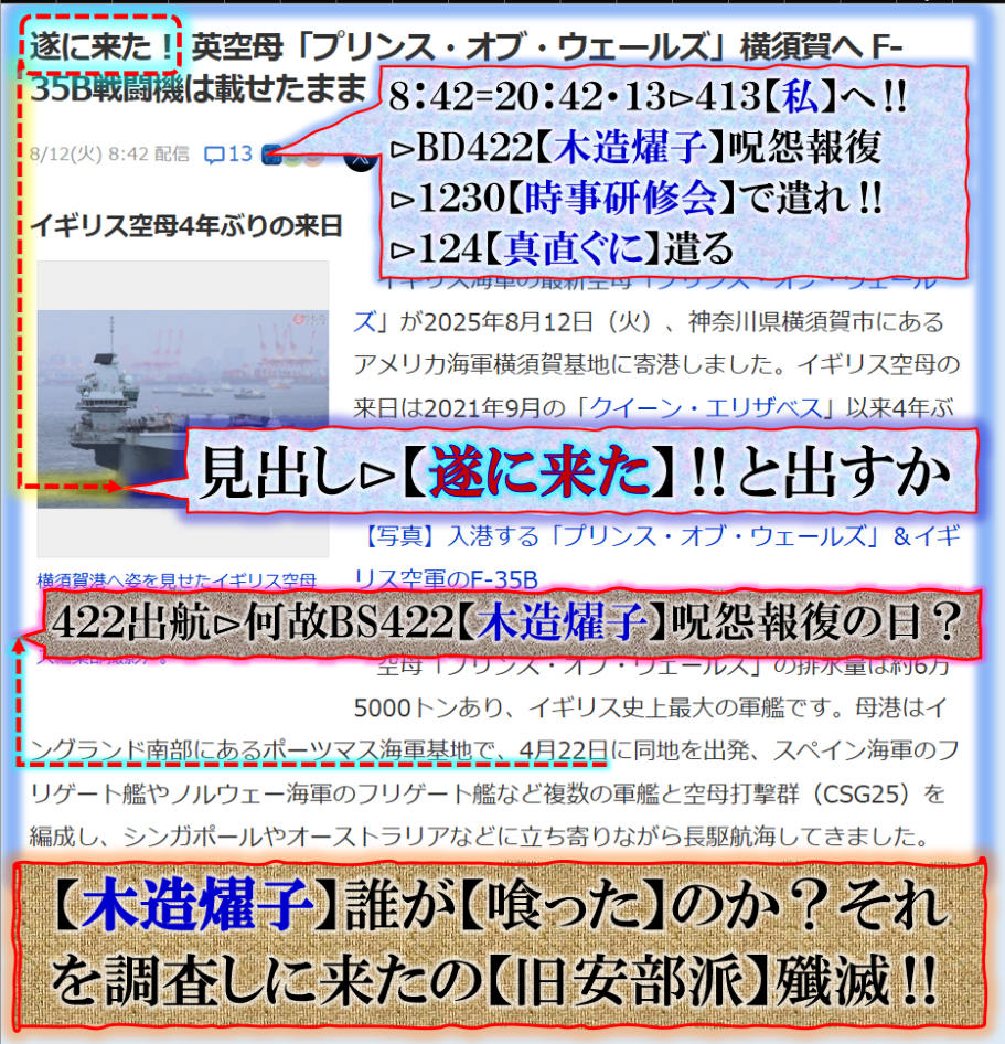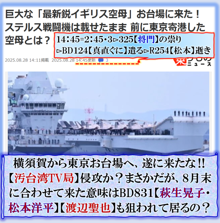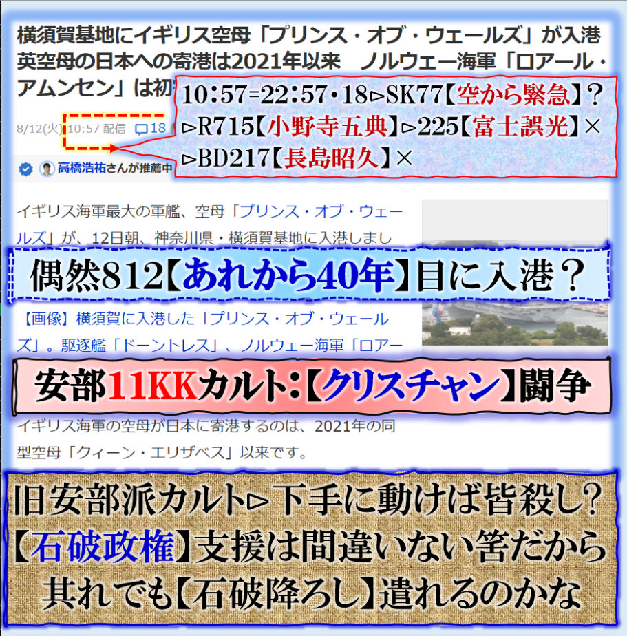 英国【ポーツマス港】を出発したのは422【木造燿子】さんの日であり、横須賀入港は812【御巣鷹山事変】の日である、是が偶然である筈がありません、その目的は【人喰い】と【御巣鷹山事変】の黒幕は同じだと見て居るのかも知れません。【諜報戦】プロ中のプロ軍団が日本国へ入って来た訳です、旧安部派と11KK、は穏やかでは居られないだろう、何時何処で遣られるか解りません。その意味「背景」で【石破降ろし】等出来る訳がない、もしもやれば其れこそ何が起きるのか恐ろしい事に成るのではないか?【恐い夏】が続きます。  sy