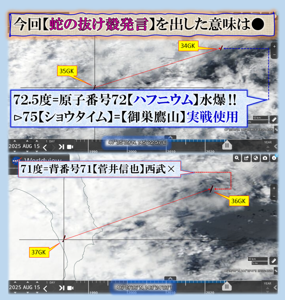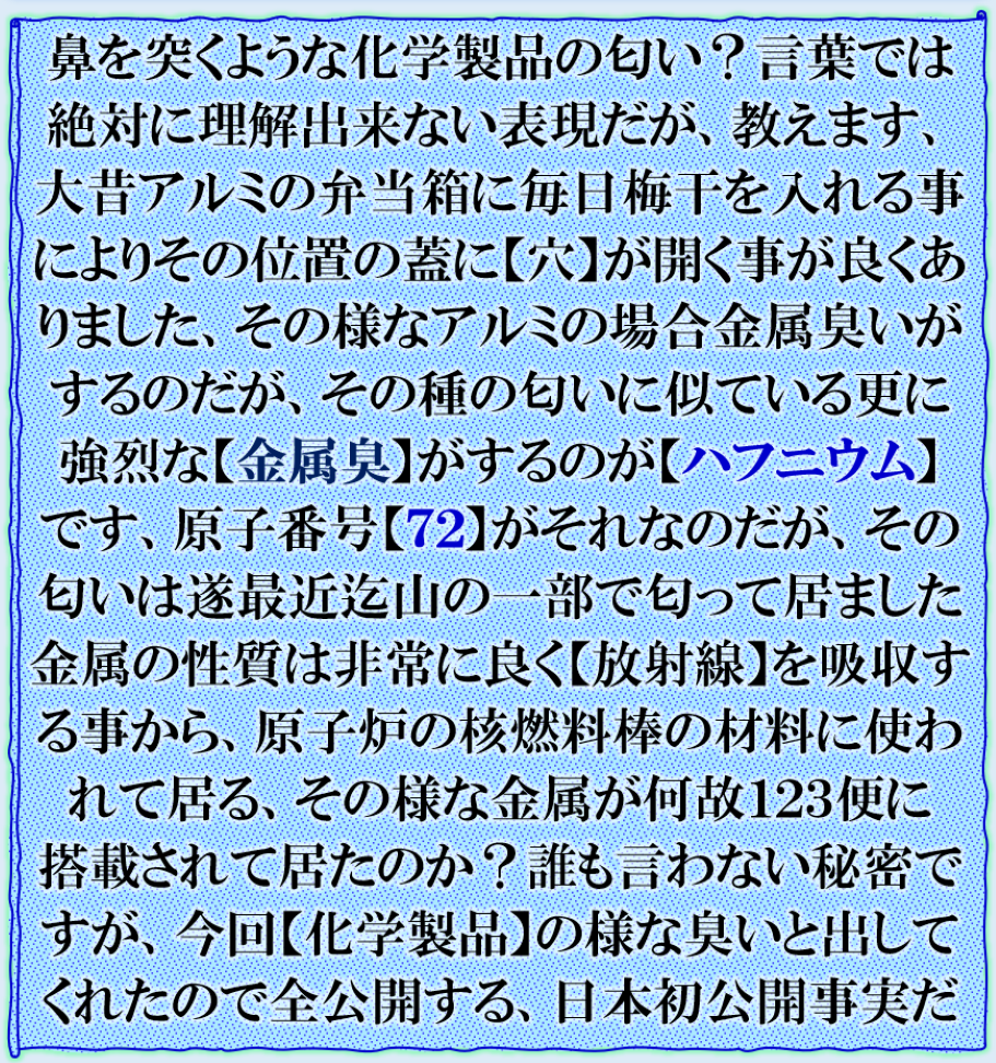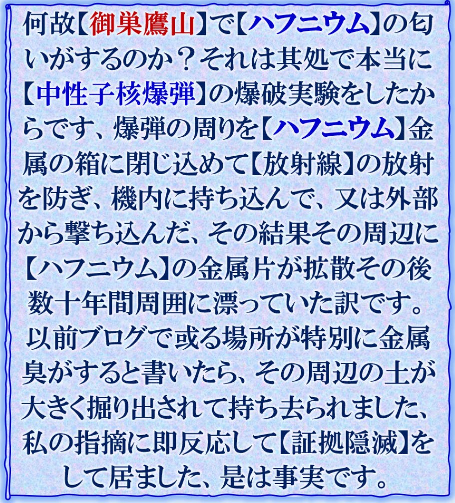 ハフニウム臭=放射線物質とはセットなのです、川上村のレタス畑から群馬県方面の山の稜線の向こう側から【キノコ雲】が揚がって居たのを見たおばさんが居ました、絵をかいて見せてくれました。TVでも放映されたので見た人は相当居る筈ですが、其処までで終わっていた、今回全部を公開するのは【私】が最初だろう、この【仮説】に絶対に間違いはありません、今回【蛇の抜け殻】の表現が出て来た意味は【私】に其れを公開しなさいと言う「示唆」であると理解をして公開して居ます。この仮説に誰も【異論】は唱えられない筈です。 sy