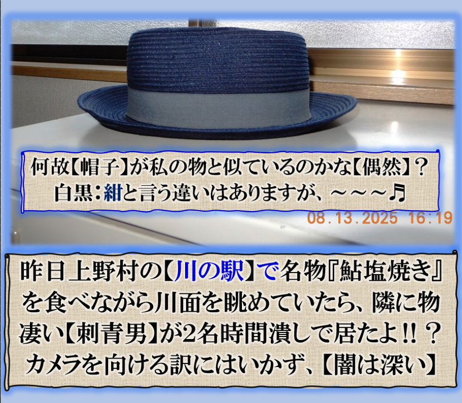 何事も【偶然の一致】と考える人とそうではない人が居る、其処で見た「刺青」はとても普通では無い【大袈裟】な物であり、一目で回りを【威圧】する様な派手な物でした、表通りからは見えない場所で【二人】が居たので、その様子から此処で【時間調整】をして居る様に見えました、確実にあの様な【薬座】は上野村の人では無い、よそ者でスが、だから【闇】の深さを感じる訳です。もっとも【私】自身も明らかに【アメリカンファッション】スタイルで行っている訳だから、対照的なのだが、隣に【薬座】の威圧では長居は無用、【鮎】を食べたらその場を離れて、即戻って来ました。 sy