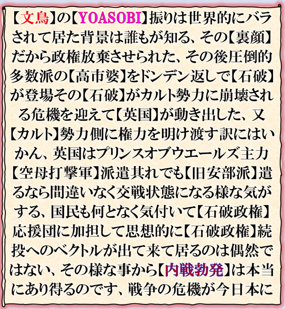 一般国民はまさか其処迄は考えて居無い筈だが、戦争が起きるきっかけは何処にでも或るのです、仕掛ける側にそのスイッチが或る訳です、日本国民がどう考えようと、【真珠湾攻撃】が仕掛けられた様に、起きてしまえば双方共に退けなく成り【泥沼】化する訳です。【旧安部派】統一教会系は今迄【日本国】を牛耳って【日本国民】の奴隷化に成功したとして日本国を我が物顔で統制して来たのだが、特に【石破政権】に成って来てからは【韓国内部】でも統一教会は押され気味であり、流れが変わってしまった、此処へ来て【石破】に選挙結果の責任だとして【退陣】等大きな筋違いだろう、悪いのは全部【旧安部派】であり「統一教会系」議員である、言わば売国奴政治家に責任が有ると言う事で論理的に整合性が取れる事を【鈴木宗男】がでかい声で騒いでくれました、全部【英国MI6】の予定通りであり、其れを支援する為に【英国空母打撃軍】が動いたのです。【黒木】を使って【和解】あり得ません。【御巣鷹山】の責任問題にも関わる話だ。 sy