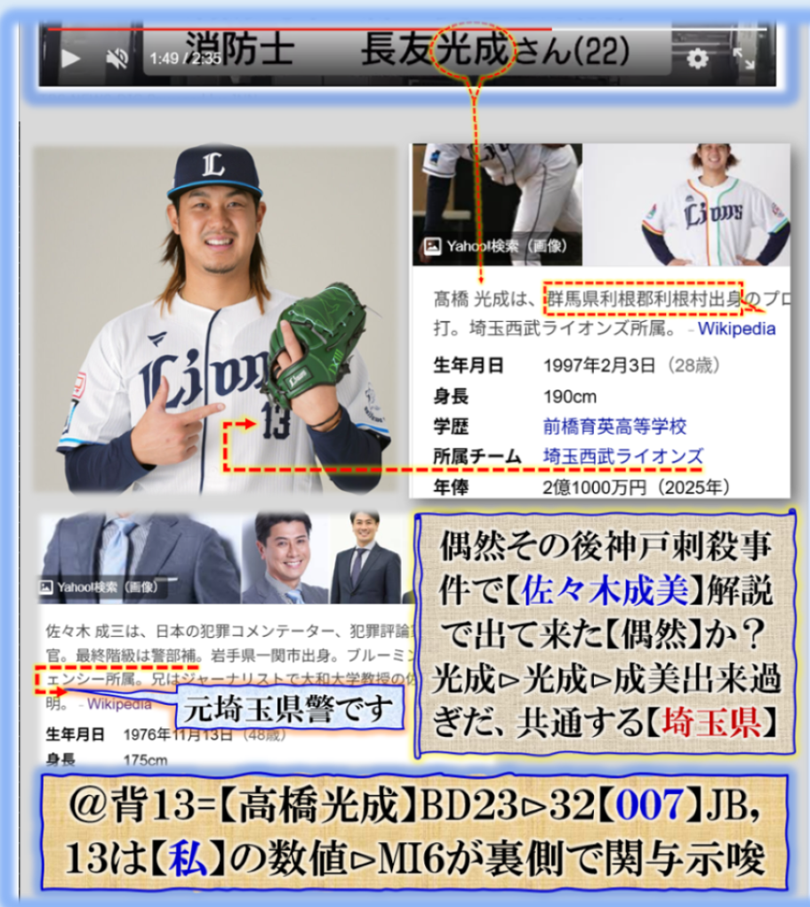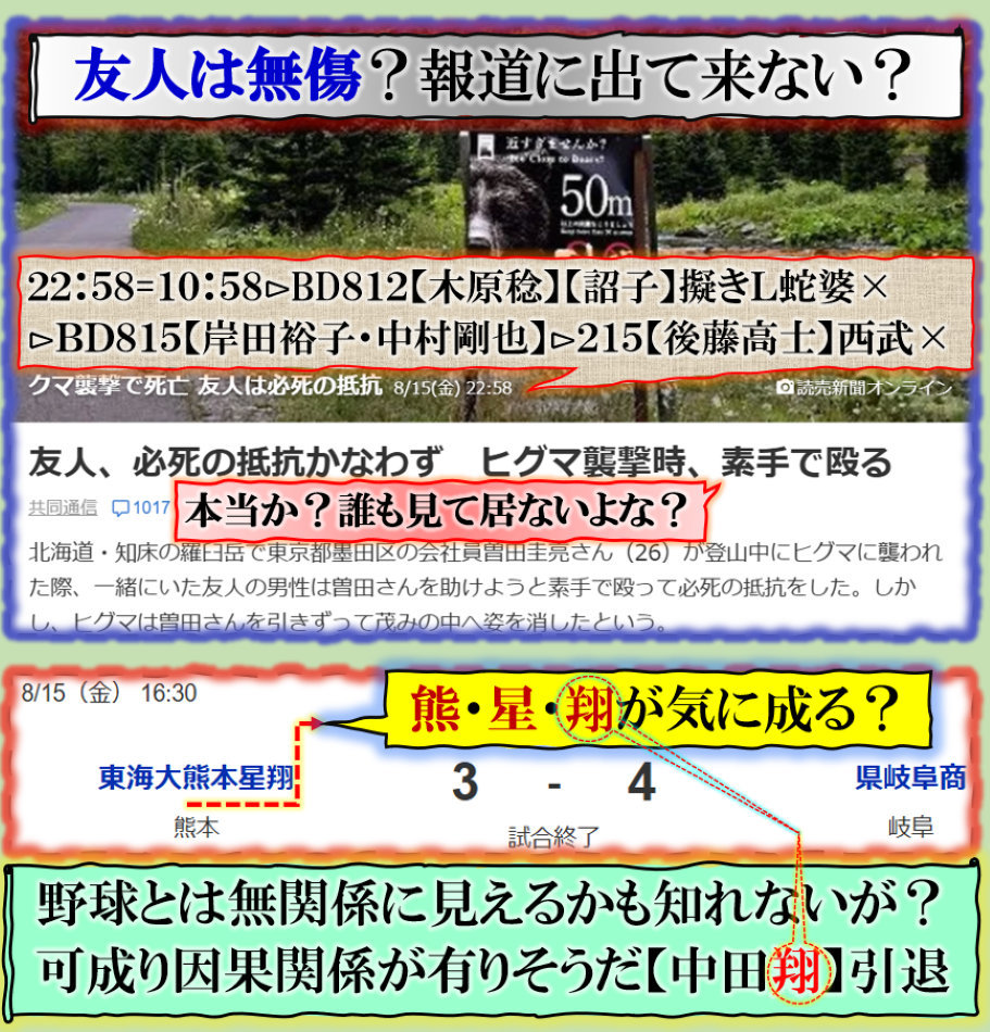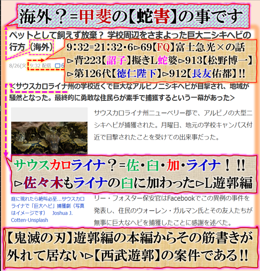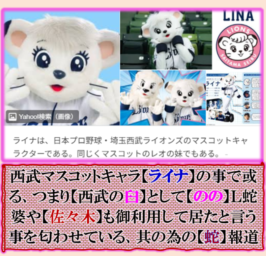 何故セットで【佐々木】とカロライナの蛇報道が出て来るのかYahooで今見て見れば解る事実です、其れが出たら【西武ライオンズ】の【ライナ】の事であり、漢字で書くと【来伊奈】是も気に成る部分ですが、此処で出て来た事は事実であり、其の為には元埼玉県警【佐々木成三】が必要不可欠だった、フジTV,の【佐々木恭子】が此処で捕まった、暴露されて居る背景には、その暴露を恐れた友人【同僚】の【丸川珠代】も居た、表沙汰を恐れて自ら身を隠した、事実は絶対に隠せません、何時か必ずきっと【報いを受ける】事に成る訳です。真実は【暗号化】以外では絶対に報道されません、だから普通の報道の中でその部分を見出す眼力が必要不可欠に成る事をお忘れなく、真実を見出して下さい。御自身が無関係な災難に見舞われない為にも。 sy