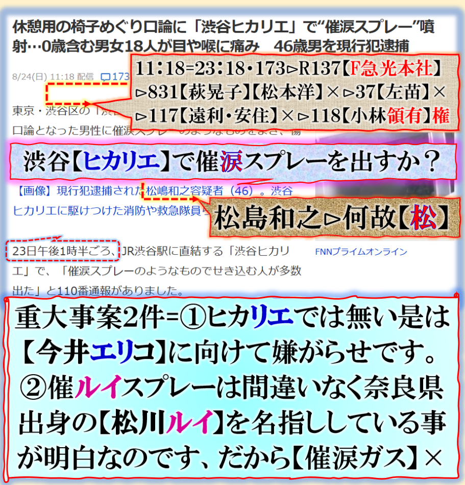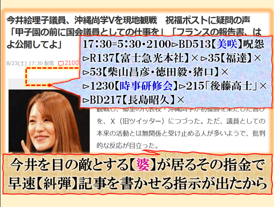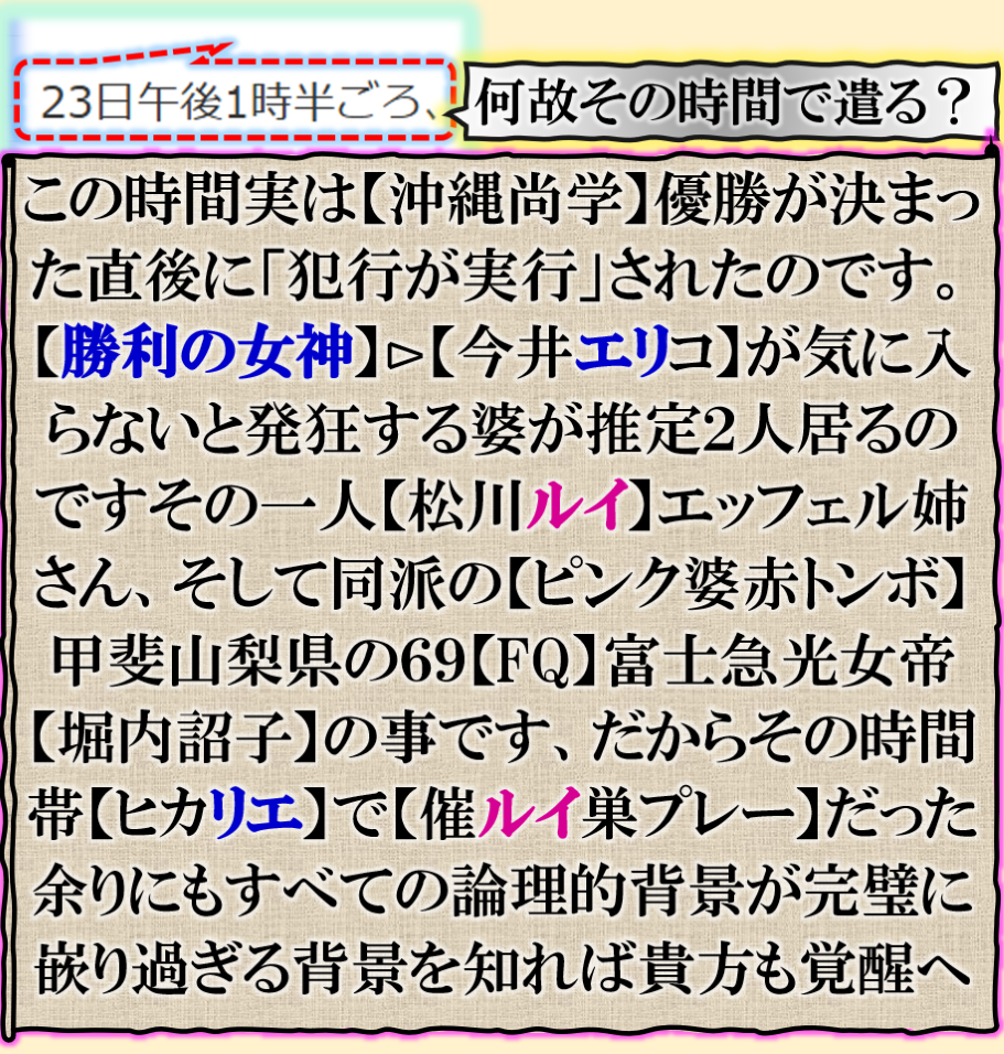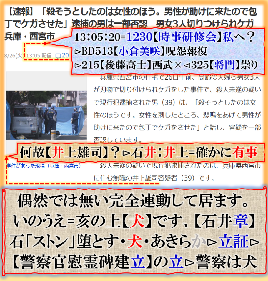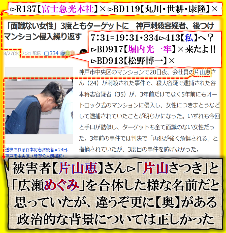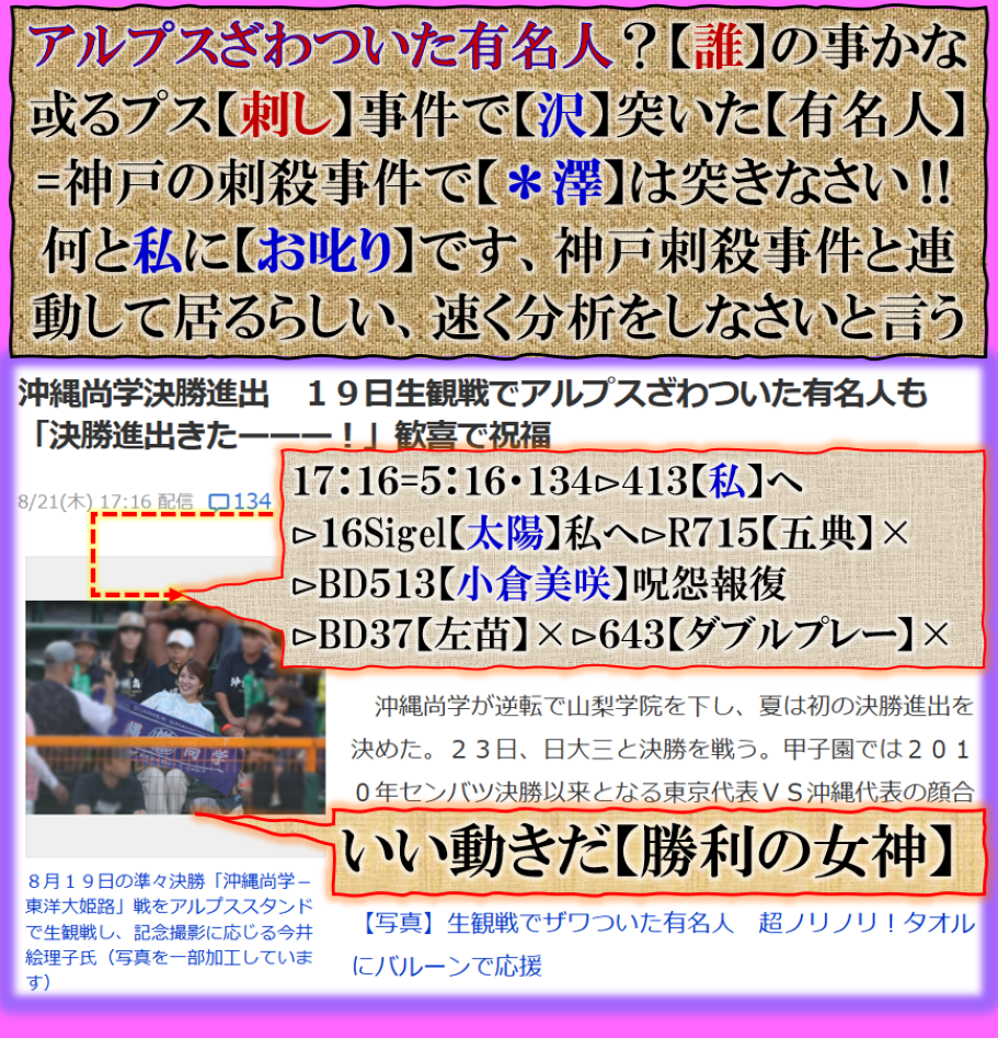 永田町の裏話=【今井絵理子】と【堀内詔子】は相当な敵対関係にあるらしいとか????⊳その真意の程は解りませんが、道頓堀狼煙、で示唆されて居た【道志村】の【トンボ】は堀内だ、と言う意味で火が噴いた訳です、その意味の連動でこの記事の中に意図的に挿入して来た【ウチナー魂】と「のりのり」の文言は決定的に【黒】です。是からご指摘の【神戸刺殺】事件を分析しますが、凄い事に成って来ました、【猿蛮国へ侵攻作戦】確実に侵攻して居る事が読み取れます。 sy