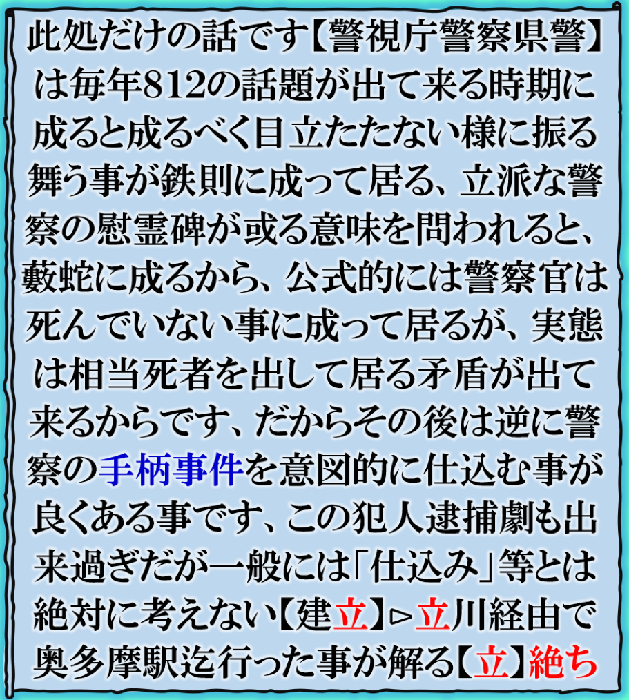 思い過ごしなら良いのだが、開戦前夜の雰囲気も有ると言う人もいる、誰と誰が闘うのか❓其れが複雑です、警察擬き&自衛隊擬きと【皇宮警察】?又は本当の【自衛隊】???一般人に話が通じる物か心配だが、更に解りやすく言えばその裏に居る【インド・イスラム】対本当の自衛隊❓???つまり既に【闘い】等出来ない事に成るから、更に市街戦部隊【民間】が居るのだが、その存在等誰も知らないので、果たして活動できるのか大変疑問だ、【日本国】では戦争等絶対に出来ない様に思える。だからその前に降伏するしかない、御巣鷹山と同じです。 sy