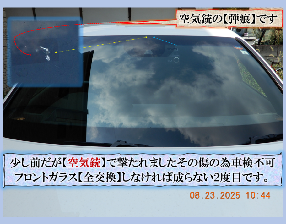 私の知り合いも撃たれた事を伝えて来た、その様子を聴いて初めて【私】の場合も【空気銃】だと理解出来たのです、この際だから公開しようと言う事に成り月後れだが此処で公開致します、知り合いは複数回撃たれて居る何れも上手く避けられたそうですが、【私】の場合は場所が好都合強度が或る場所だった、更にガラス面の傾斜が強かったので強化ガラスが致命傷には成らなかった訳ですが、車検は通りませんのでフロントガラスは交換しなければならない、この日本国でその様な事が起きて居るのか❓現実にあります、誰も其れを取り締まる事は出来ません。日本人は【奴隷】だからか❓ sy