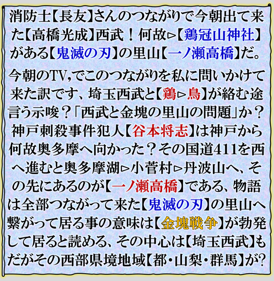 何を「絶ち」なのか、この流れなら当然【トンボ】の【掘の】人の事では無いか❓本人は恐らくは自覚が無いだろう、でも周辺はトンデモなく迷惑な奴だと言う噂は物凄くあるのです、永田町の【女】はほぼ全員そうらしいが普通の神経では女性政治家は務まらないと言う事が【豊田真由子】さんも言って居ました、道頓堀事件から始まって、遂に奥多摩迄来たのか❓その国道を更に進めば【丹波山】⊳【大菩薩峠】⊳旧【塩山市】へ繋がる、その周辺こそ【鬼滅の刃】の物語の故郷である、その【刃】で刺殺された女性は【片山恵】さん、本当は【代理】で遣られたと思われる、本当に狙われて居る人は【トンボ】の事だろうと思われる訳ですが本件は微妙な事件でありますので余り詳細を書く訳にはいきません、是でも相当控えめで公開して居ます。 sy
