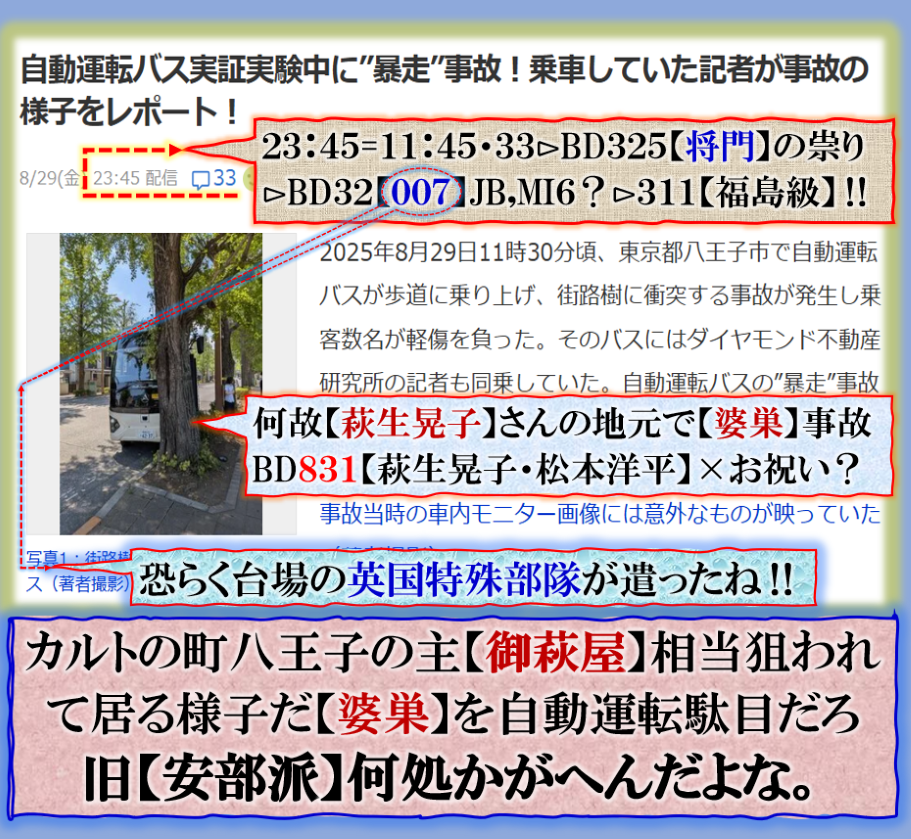 この事故が偶然である筈は無い、確実に狙われて居る、バス【婆巣】が銀杏の木へ突撃?❓?❓?⊳銀杏が紋章の元【東京都議会自民党会長】現在は【井上信二】君青梅奥多摩地盤の人、奥多摩で捕まった【谷本将志】はその為に【神戸】~【奥多摩町】へ来て捕まりました。全部【MI6】の作戦行動だったのかも知れません、本当に其処迄遣るのか、何処までも遣るのです。【御萩屋】さん、完全に終わったね。 sy