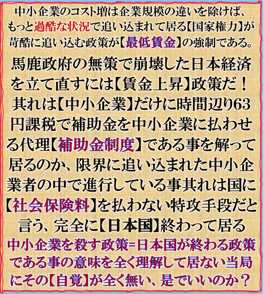 国は中小企業を殺す政策を止めろ、社会的構図で一番弱い体質の多い中小企業に対して、更に追いこむ政策其れが【最低賃金】加算命令である、其れで何が起きるか全く理解して居ない【お役所】にその先に何が来るのかを読めて居ない、国の失政の付けを全部中小企業に代理支給させる「補助金制度」の執行を全部【中小企業】に払わせると言う政策でス、其れに対して対抗手段として【社会保険料】の未払いだと言う流れが出来ているらしいと聞く、是こそ【国家が崩壊】して居る事を意味するのです。 sy