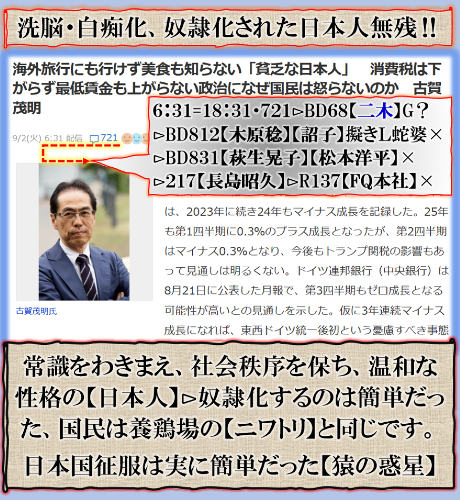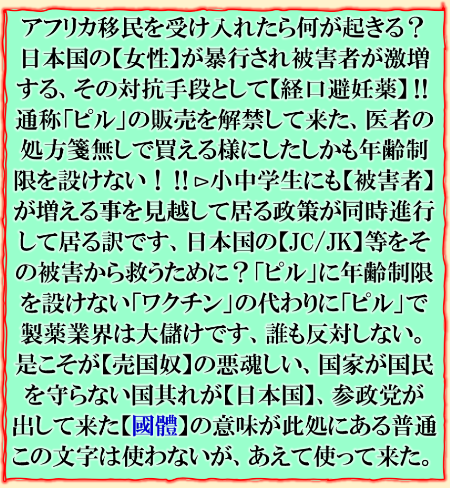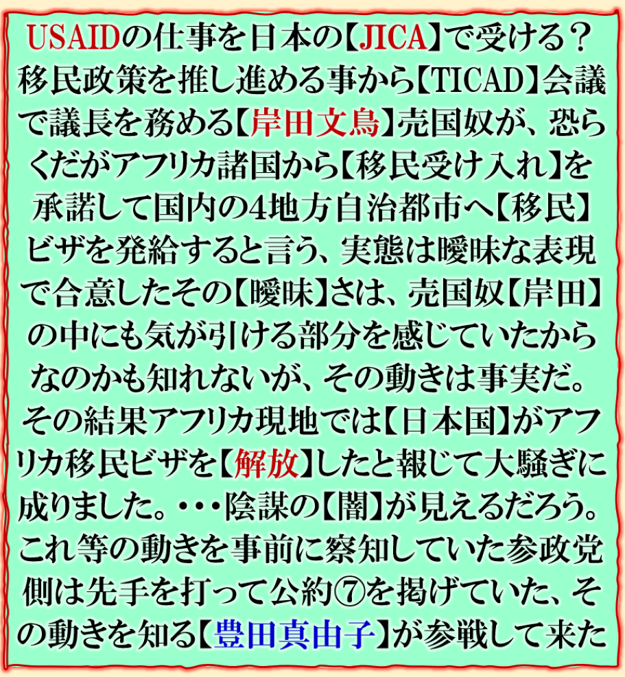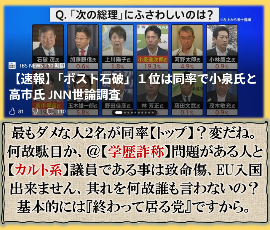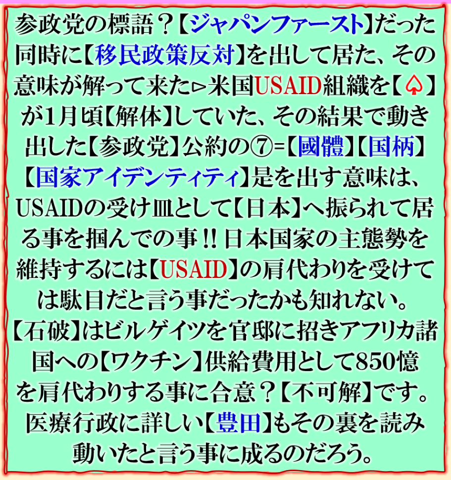 皆その実態を本当は知って居てやって居るのか❓其れです【日本国】【日本人】の奴隷化に成功した、国民は奴隷だから【日本人】を抹殺して【日本国民】の人民浄化【種族消化】が目的なのか❓政治家は全く【国民】を見て居ないのは、其の為です、だから出て来た【日本人ファースト】⊳【参政党】が大躍進した裏が是なのです、既成政党の【欺瞞性】を糾弾して来た、国民目線でその流れに追随して来た【国民民主党】も其れだった訳です、自民党は既に【売国奴党】に落ちぶれた、国民は支持しないだろう、誰が「党首」に成ろうとも【日本国】は変えられないだろう、国民は既に【自民党】を捨てた事は明白に成って居る。 sy