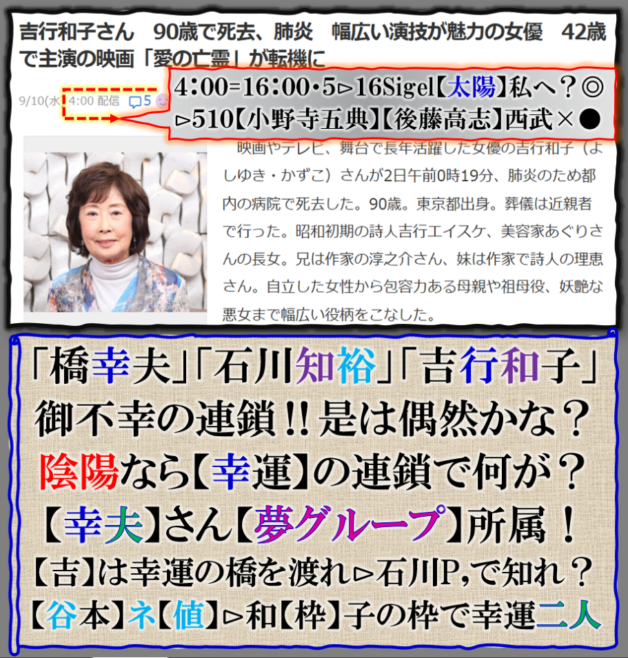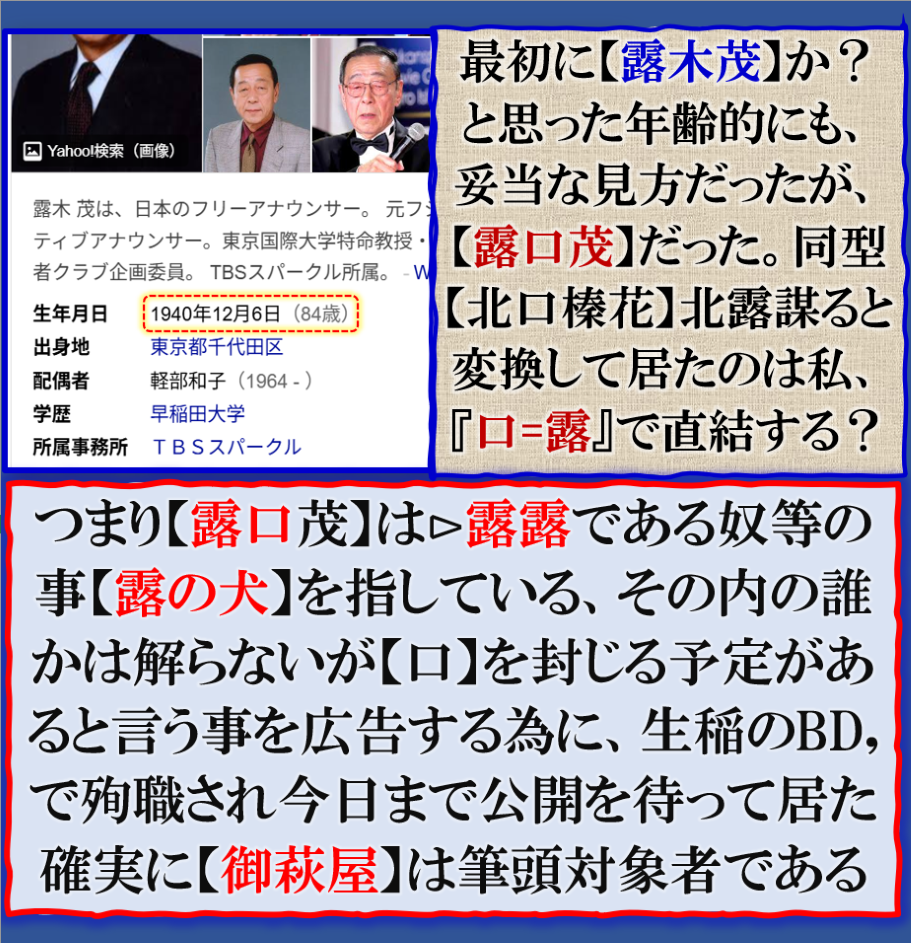 4月に死亡していた❓普通では無い構図です⊳英国の【プリンス・オブ・ウエールズ】が日本へ渡航が発表された頃では無いか❓・・・その後【露口】の報道を完全に止めて置いて、今日出して来た、つまりこの作戦の根底に或るのは【007】JB,の作戦行動だったのではないか❓何の為にやって居る❓其れは当然BD428【生稲晃子】の為に、その相手BD831【汚萩屋】八王子の【カルト】系政治家が狙いである事は明白なのです、奴一人では無い筈ですが、その周辺で異変が起きて居る筈だと思われますが、一般公開されるかどうかは解りません,密かに処分され、一般公開されない計画だから、【暗号化】で出して来ている訳です。此の事件の背景で【維新】の【石井章】が選挙違反で政治家辞職して居る問題も【同期】して居る、維新と関係あるのか❓大いにありでス【維新石井】は台湾系議員だ、其れは裏で【露】と繋がって居るからです、【御萩屋】は旧安部派の筆頭悪であり、【マリオ】による北方4島売却事件に関わって居る筈だから、【安部】の口を封じて、次は【汚萩谷】もと言う流れが有ると考える事は妥当である、本当に其処迄遣るのか❓何処までも遣る其れがこの世界なのです。 まるで【映画】みたいな流れだな、そうなんです。sy