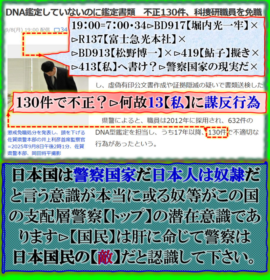 以前から【埼玉県】に入ったら其処は【サファリパーク】だと思え!と言って来た訳ですが、本当は【埼玉県警】の事なのだが、実はその他も全く同じであり、日本人は【警察】を信用するな、と言う事を更に見せ付けていた事件が起きた、警察は永田町・皇居よりも上に居る、事実上この国は【警察国家】だと言う事実を認識して下さい、奴等は絶対に信用してはいけません、日本人や【国民】の敵です。更に不可解な事がある、警察擬き?【コスプレ警察官】が現実に居るらしいと聞く、怖い話です。 sy