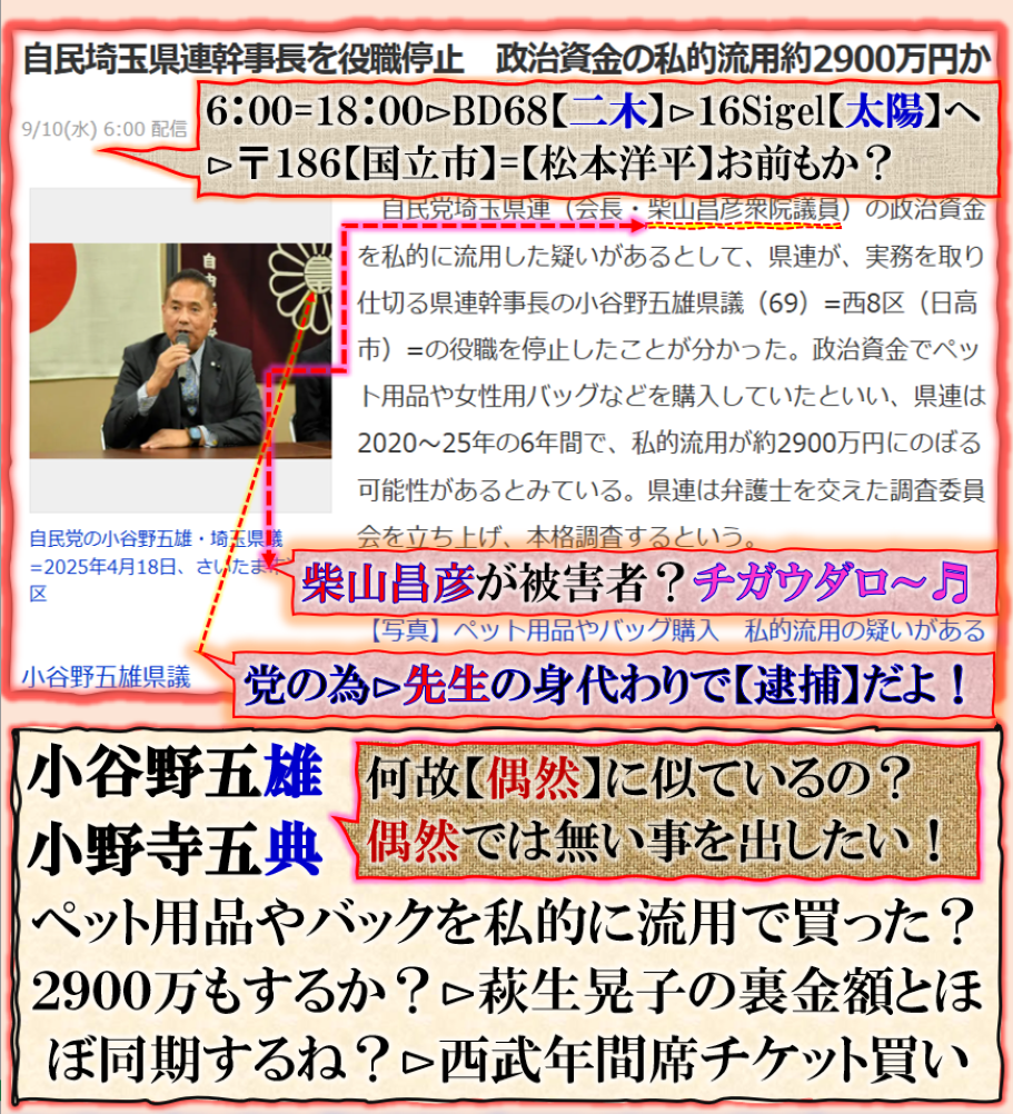 【ハッキリ言ってライオンズびいきでス】とラジオで本当に言い放って居た人【小倉智昭】も実はこの問題に深く関わって居た、その結果【破産】?癌で死亡した、本当は【口封じ】?その流れの分岐側に本件【小谷野五雄】資金流用で【逮捕】だと確信します、事前にこの結果を見抜いた【丸川&大塚】君は落選の道を選んで【政界】から蒸発失踪した、・・・是で全部では無い筈だから、未だ何が出て来るか解りません、自民党は既に【少数野党】に近い奈落の底に堕ちてしまった、もう【裏金】等捻出する能力など有りません、未だ【未清算】の被害者多数居る様な気が致します、自民崩壊の余波が此処に一つ出て来たと言う事に成ります。表側を見るより【裏側】は凄いです。 sy