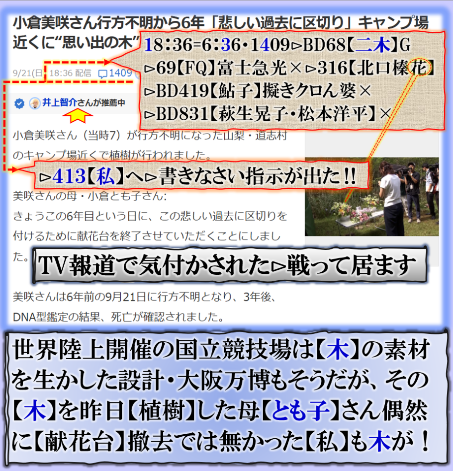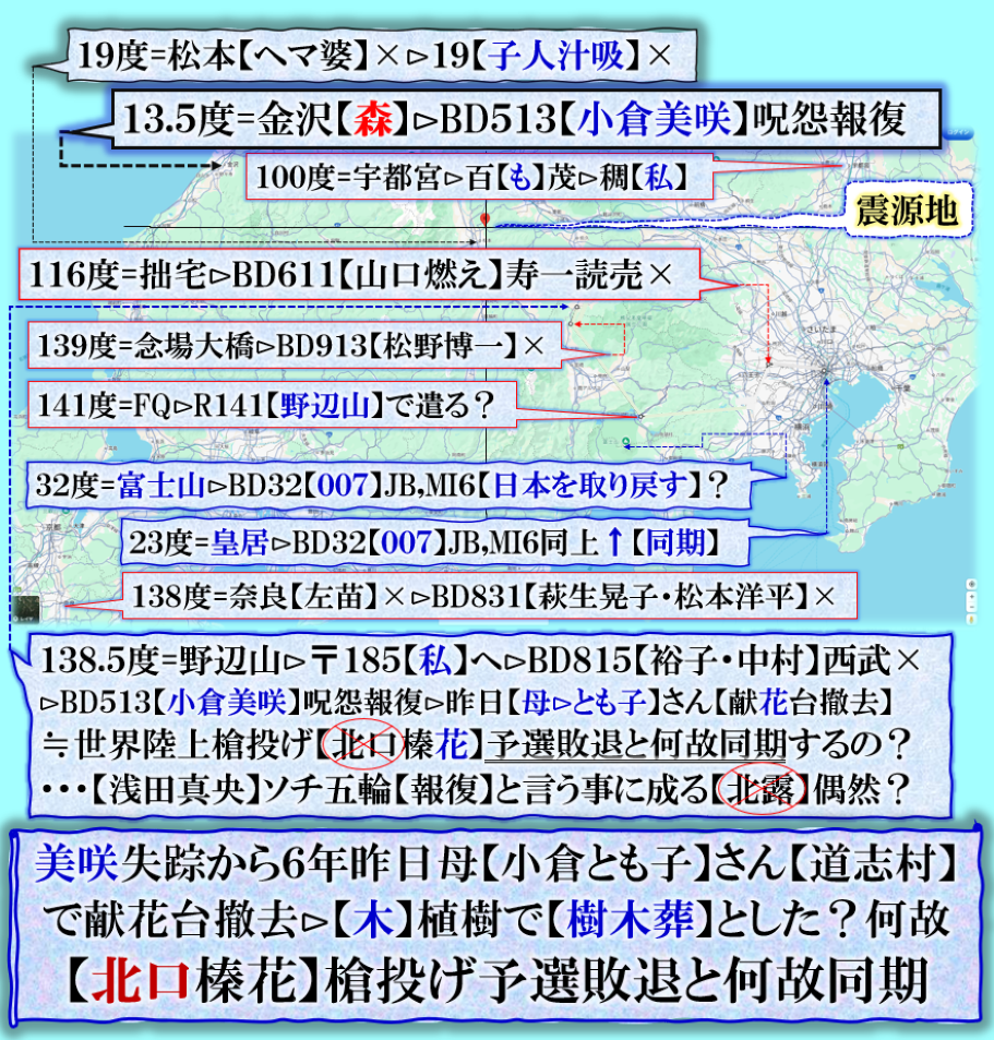 槍投げの【北口榛花】が何故か予選敗退で【涙】していた!!!‼即思い出しました、ソチ五輪の【浅田真央】と重なった、但し是は偉大な【陰陽構図】その画面を見せ付けていた訳です。【浅野殿モーセの王】:【北口榛花北ロの謀る・・・ソチの借りを東京で返した構図なのですが、理解出来ますか❓⊳昨夜の代々木【世界陸上最終日】は【陛下御一家】で観戦されました、是こそがその意味でもその場所へ出て来る事が必須でした。 忘れていたが、昨日は何故か【小倉美咲】さんが道志村で失踪した日,あれから【6年目】だった、母【とも子】さんは【献花台】を撤去して、その代わりに【植樹】をされたそうです、凄過ぎます、何故【花台】を撤去???【北口榛花】≒北ロの花を撤去で【木】を植えた=私の手口でス【木型】で物事を分析する事と完全一致の意味を理解して下さい。 sy