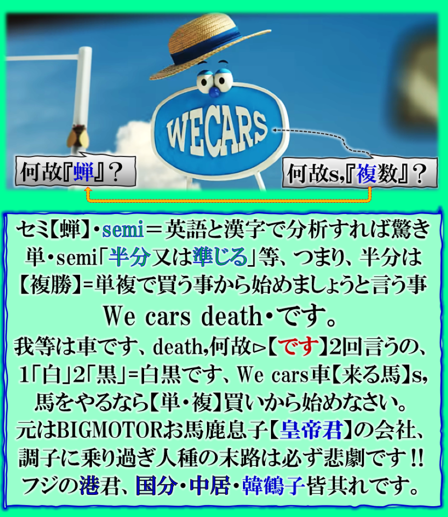 本当は⊳中古車販売会社のCM,なのだが、実は完全に【競馬学】競馬をやるなら【単・複】買いから始めなさいと言う意味の【CM】です、当然この裏側に居るのは【JRA】なのですが、それを出さずにここまでの【暗号化】仕込みで【車=来る馬】の世界へのお誘い、何から始めるのか❓其れを教えている訳です、当然ですがこの事実に誰も気付きません、だから【私】が出す以外にありません【職務】でもありますので、・・・【変伝処】としては本件の解読版を公開する事にしました、この様な世界がある事にお気づき下さい。世の中は単純ではありません、必ずその【裏】があるのです。 貴方も腕を磨いて一発大逆転【人生を変えてみませんか】総て貴方の努力次第なのです、と言う訳です。 sy