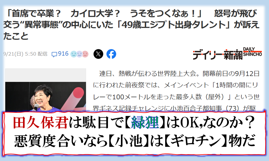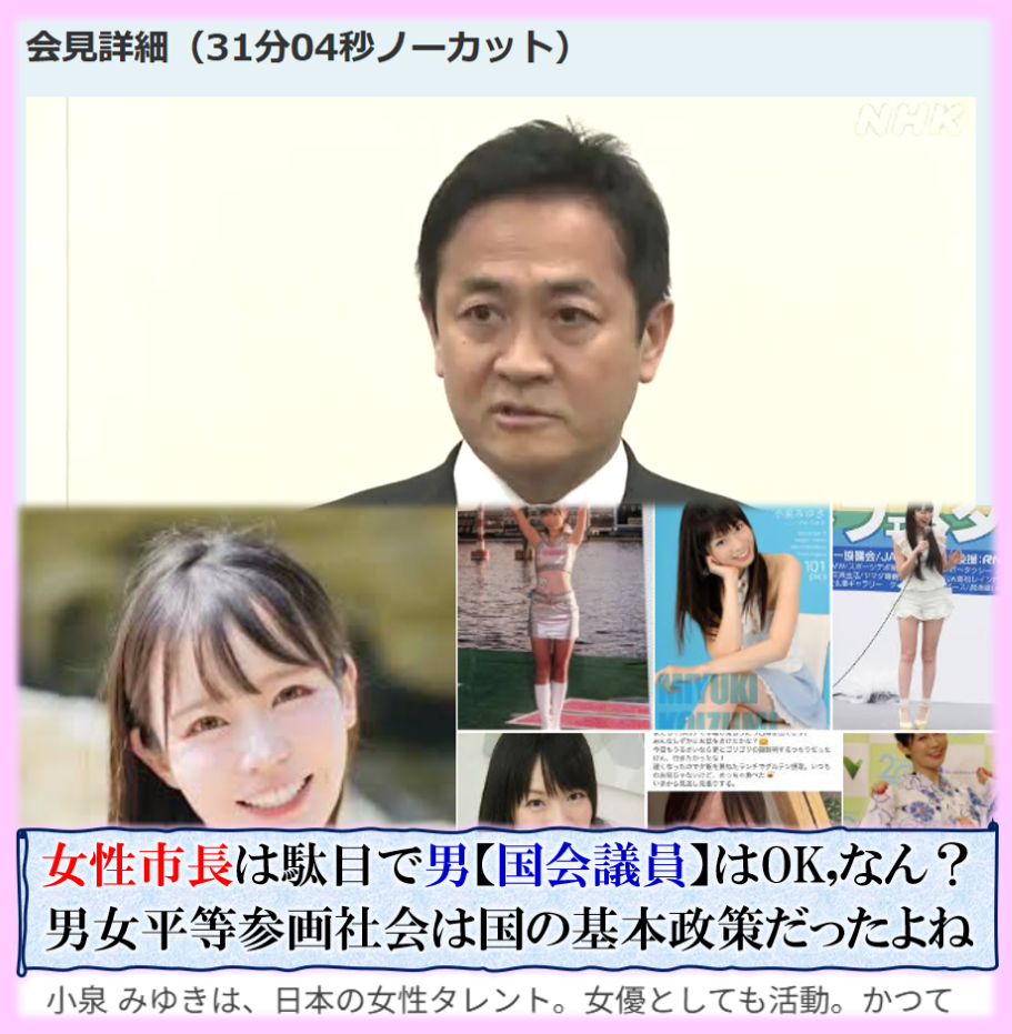 本当の狙いは【小池】潰し?&【国民】潰しなのか❓つまり【それ】は罠だったのか❓あり得ない話では無い、永田町の先生方の裏側では、此処では絶対に書け無い縦横に入り乱れて【交遊関係】がある、堂々と出して来た【岸田文鳥】等は好例であるが、元国会議員であった【上西小百合】は【不倫】をしていない国会議員は居ません、皆クロだと言っていた、その問題で議員辞職に追い込まれたのかも知れないが、其れが事実の様子です、つまり【玉木君】はミスっただけ、議員同士のそれは誰も書け無いから、表には出て来ないだけ、不倫問題で【前橋市長】を断罪する事はナンセンスです。 sy