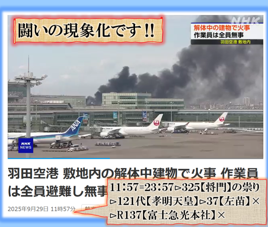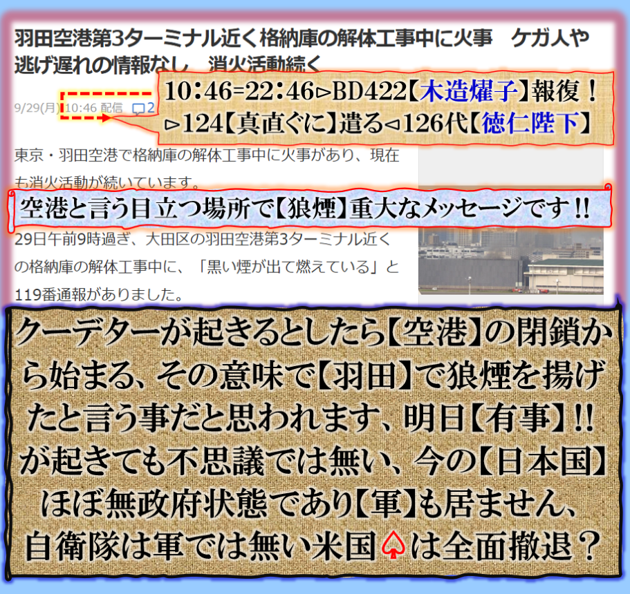 【狼煙】は意味無く揚がりません、是を見て何も気に成らない人は幸せな人です、長生きして下さい、~~~♬⊳羽田空港敷地内の【格納庫】から揚がった???⊳書く【NO子】?⊳【詔子】の事か❓何処の誰なのか?・・・北露の謀る事?⊳何の事かは解らないかも知れないが、味方では無い【敵】側の作戦行動の結果です。 sy