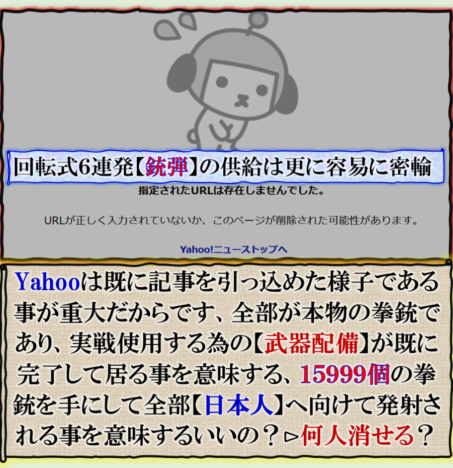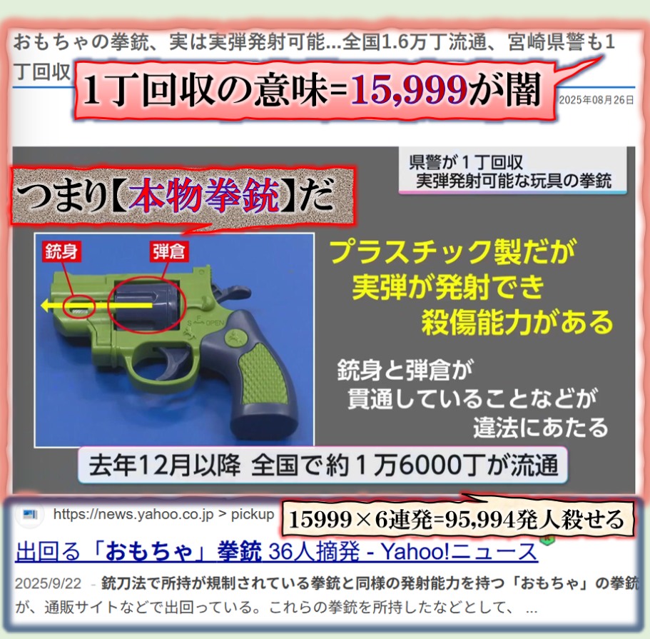 樹脂製の拳銃配備は完璧に成功して居る、其れが何時どの様な場面で国民が【目にする】時が来るのか❓・・・明日かも知れません。貴方の前に其れを持った奴等が殺しに来る日が来るのです。日本国内で【有事】の事象が起きた時に其れは一斉に出動して【日本国民】に向けられる時が必ず来る、是は嘘では無い必ず来ます。 sy