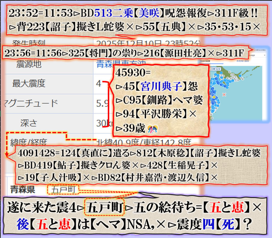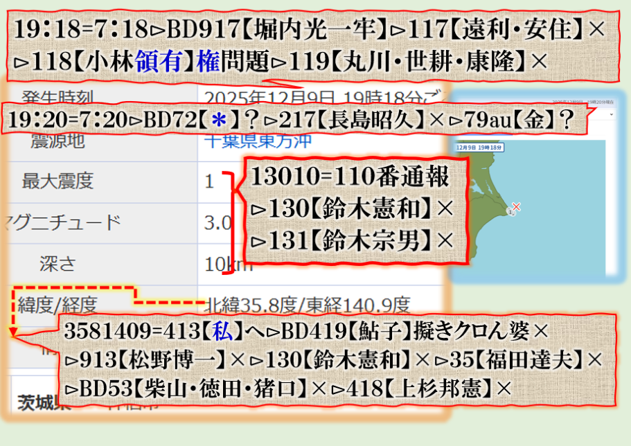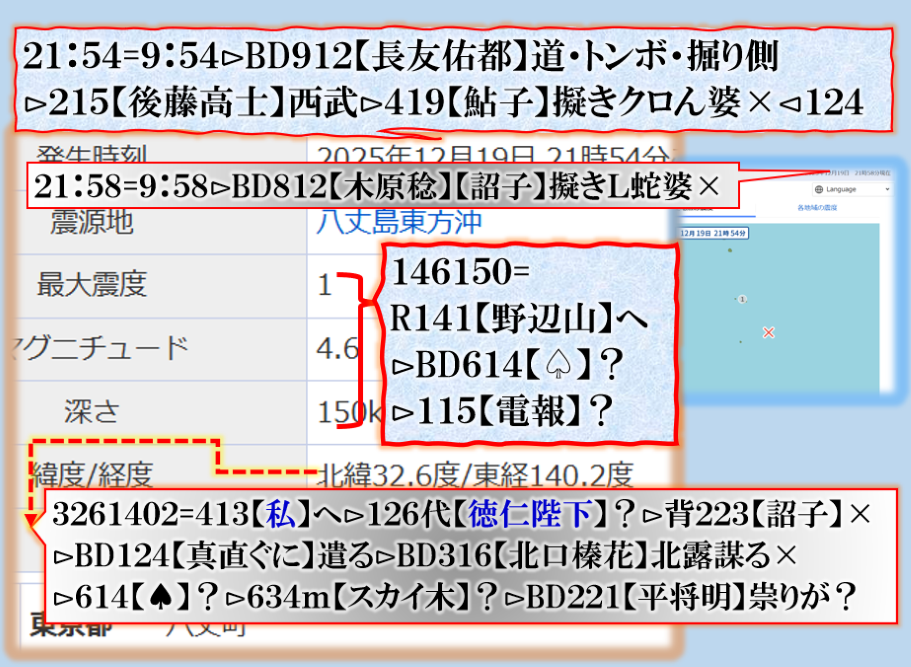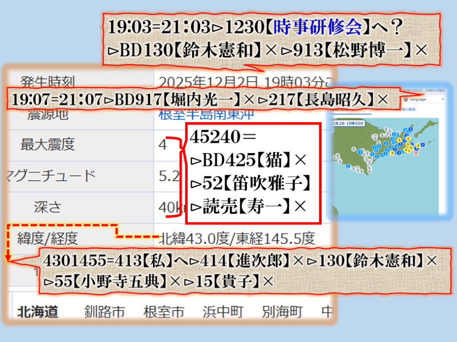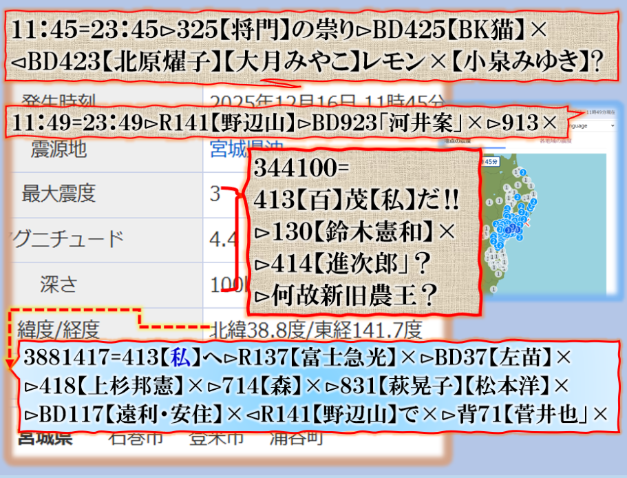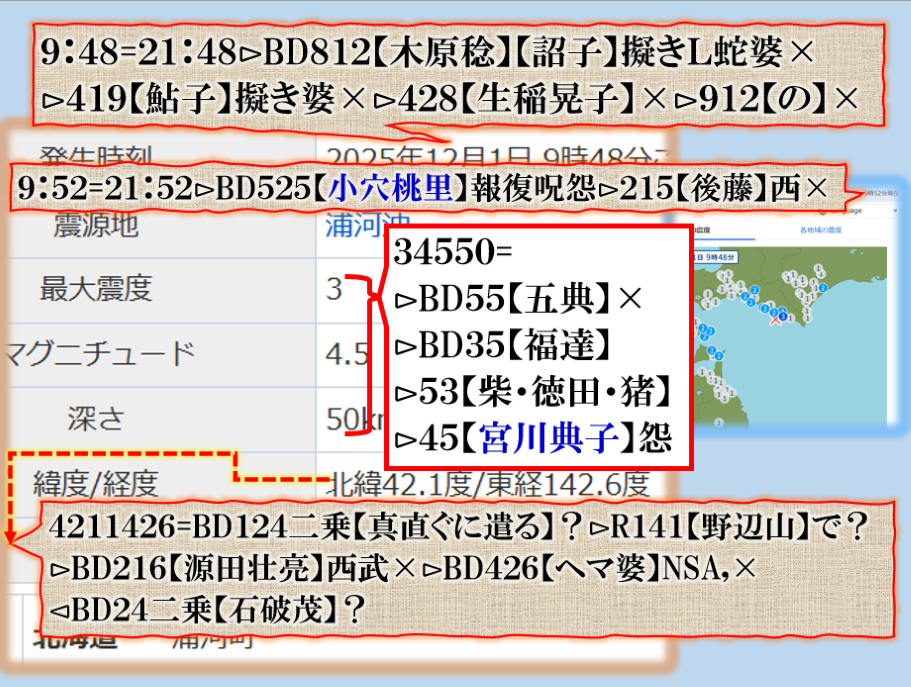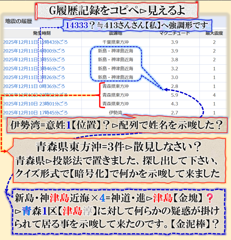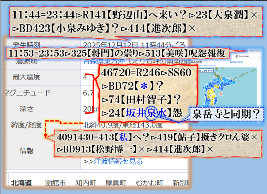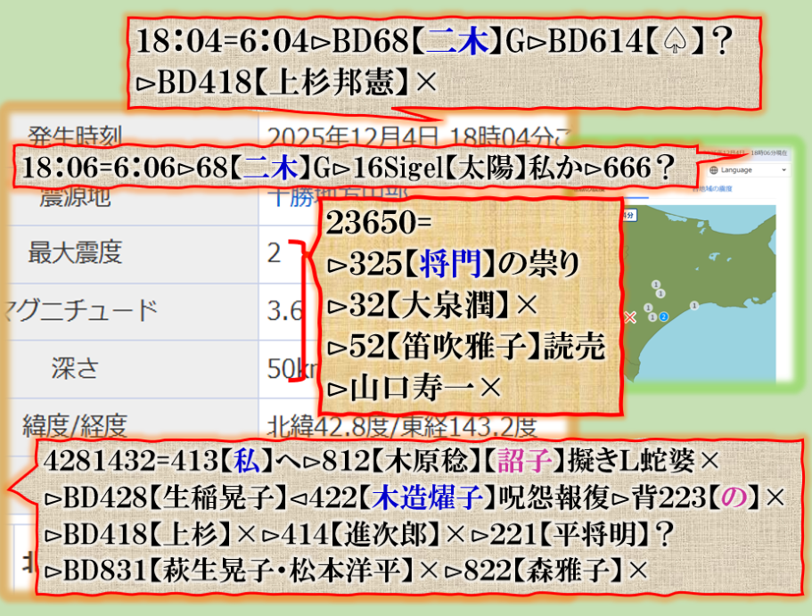 恐らくだが、誰もこの事実を理解出来ないかも知れない、又は偶然だ、意図的な決めつけだろう、と言う結論に至る筈ですが、偶然なら彼方此方で偶然発生が多過ぎないか❓その内にこの人何かで問題を起こす筈です、青森県東方沖GG⊳八戸・五戸大揺れは其れを示唆する為の振動電報だったと思えば良い。結論は時間が答えを出してくれる筈です。Death. sy