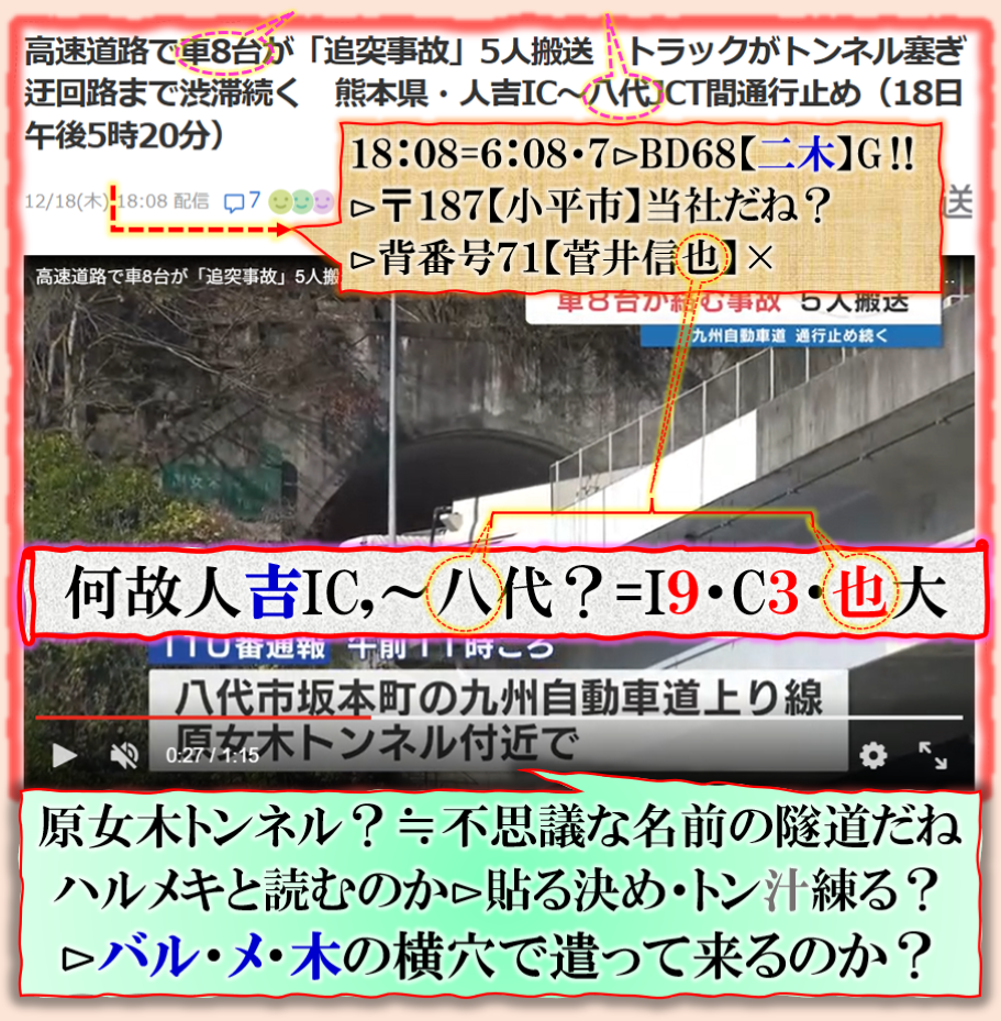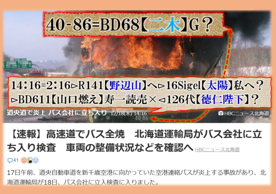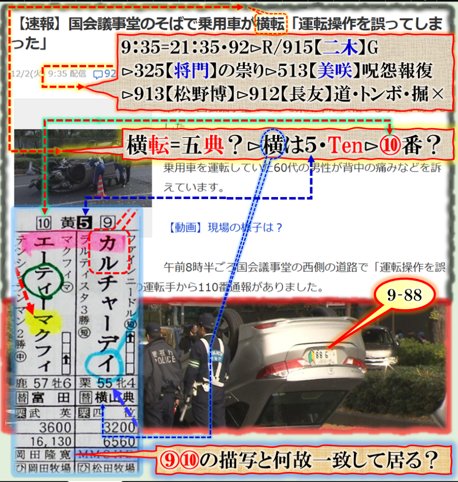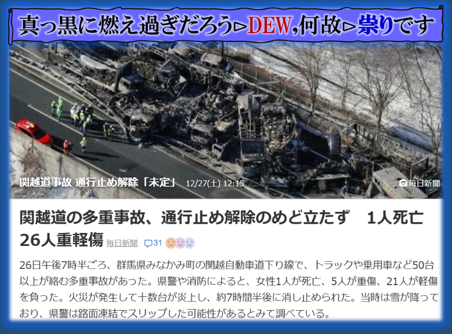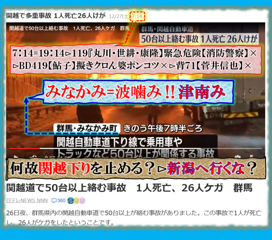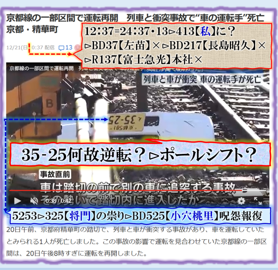 絶対に変な事故でス、死亡者名が誰か出て来ないのは何故❓電車と車?≒殿者と来る馬?の【成果待ち】の事なのか❓・・・暗号化では車=【来る馬】行く年来る年≒行く馬・来る馬‼そう言えば来年は【午年】ですから、此処で深く関わる事が推理される訳です、結論は出ませんが、普通の事故では無いから憶測が広がる訳です、何が起きるのかは是から時間経過で浮き彫りに成る筈です、Death. sy