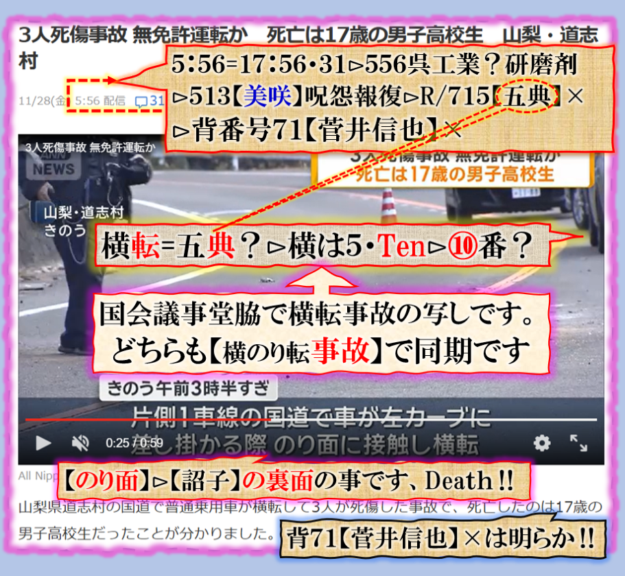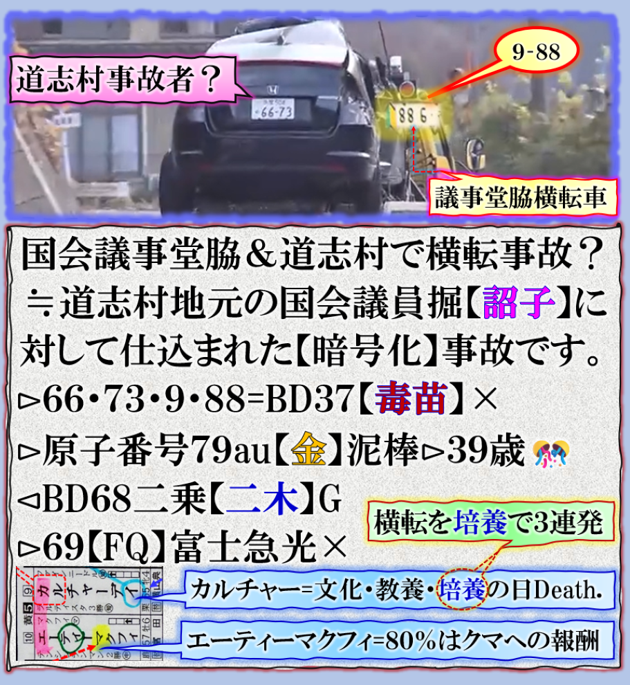 11月29日R141南清里付近で午後4:30頃に車の【横転】事故現場に遭遇して居たのです、事故発生直後を見せ付けられて居ました、だからこの事故【横転】も異常なのです、其れだけでは無い異常な【同期性】等も出て来ますので、本件は明らかに【暗号化】による事故の仕込みである事が推測出来るのです。非常に興味深い事故でス必見です。 sy