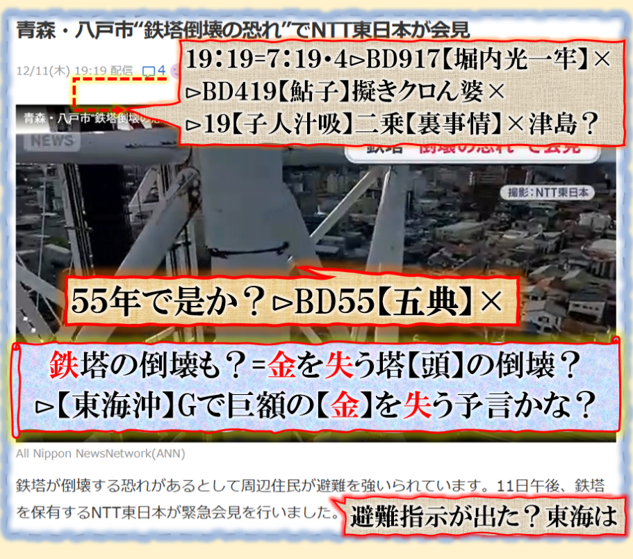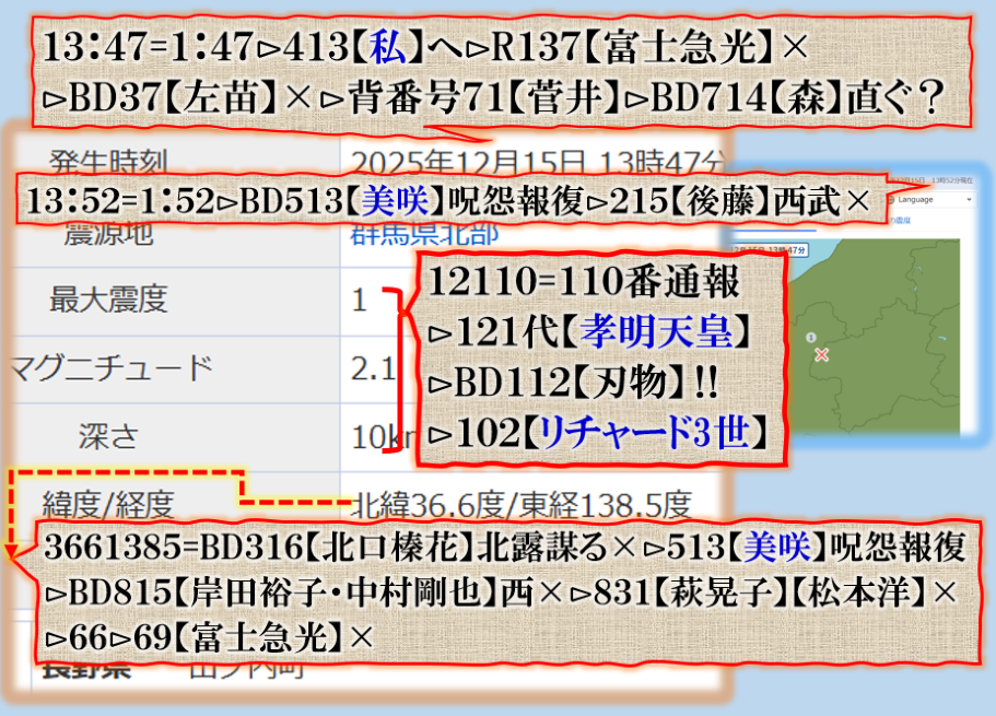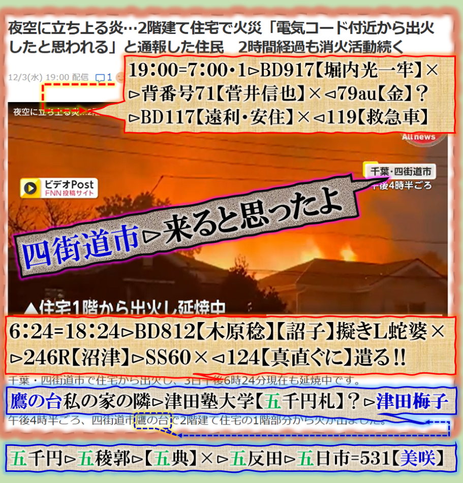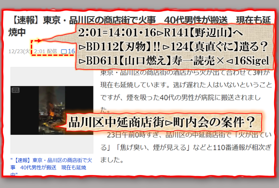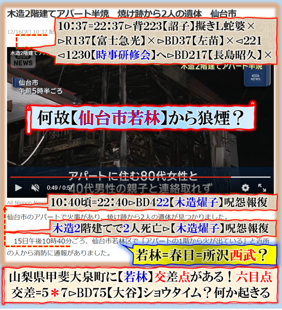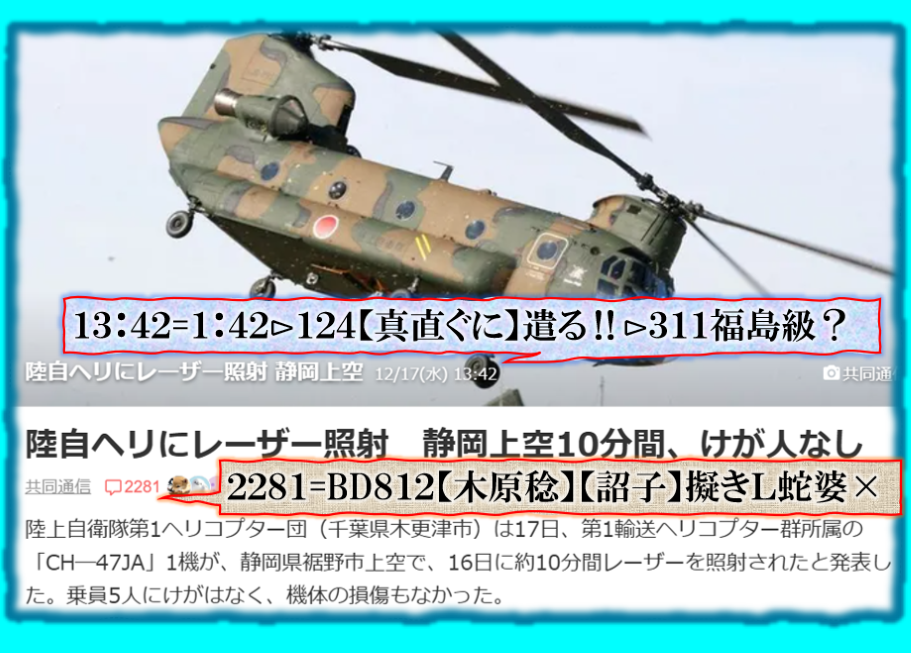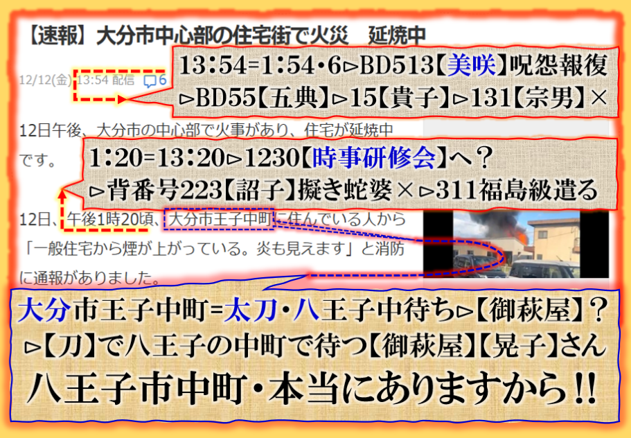 2件同日発生の目的は?⊳恐らくだが【広島文鳥】と【大分源田】&【八王子萩晃子】さんにベクトルが】効かせてありますよね❓私の見方ではそうなる訳です、普通の人には絶対にそうは見えませんが、是は間違いなさそうです、何れ身辺に何か起きる筈ですよ。其れだけでは無いと思います、その他は【暗号化】で更に深くメッセージが込められている様子です、その分野は皆様には絶対に読めません。 sy