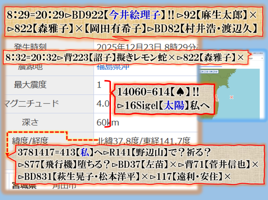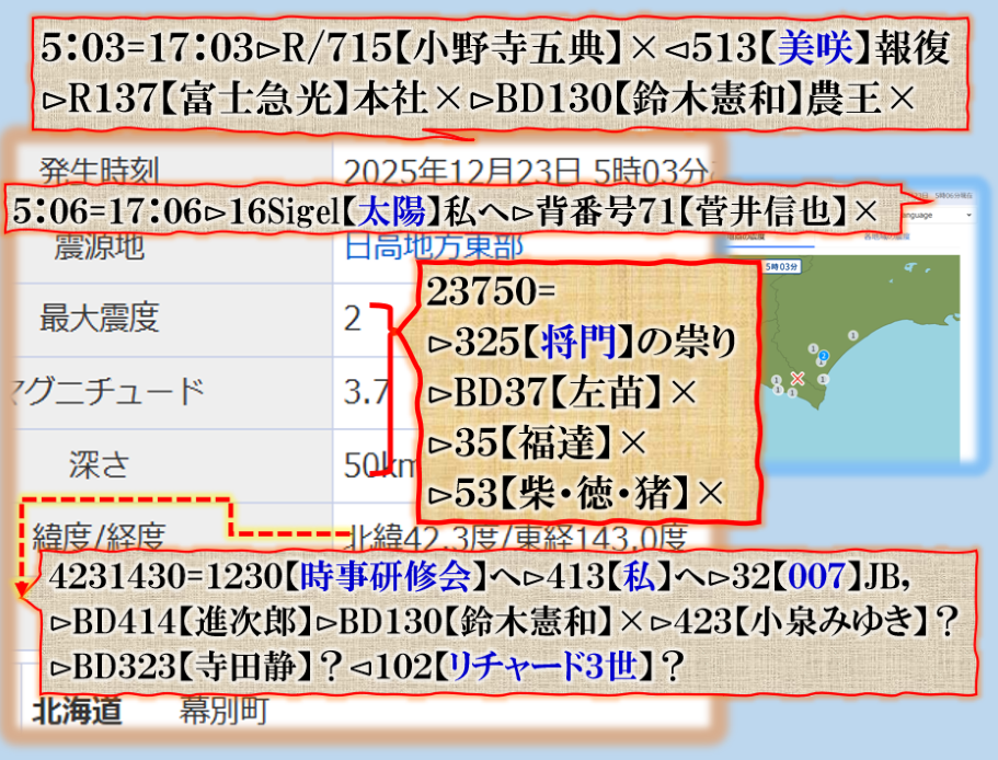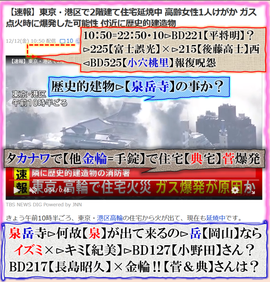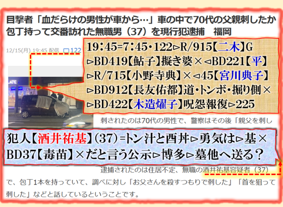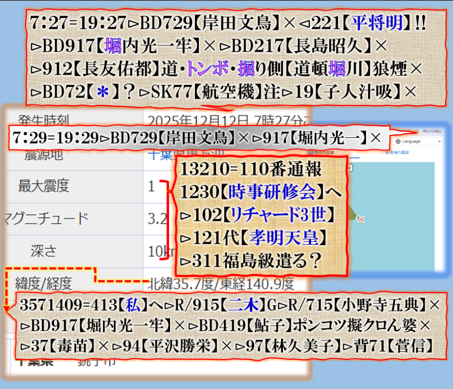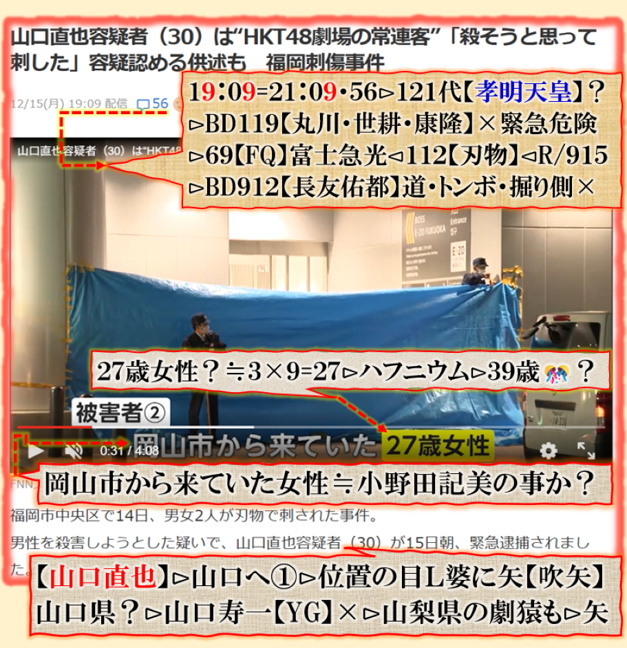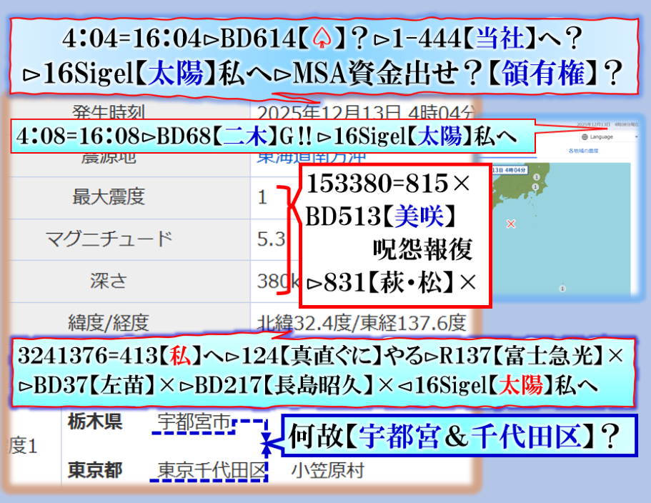 2件同日発生の目的は?⊳恐らくだが【広島文鳥】と【大分源田】&【八王子萩晃子】さんにベクトルが】効かせてありますよね❓私の見方ではそうなる訳です、普通の人には絶対にそうは見えませんが、是は間違いなさそうです、何れ身辺に何か起きる筈ですよ。其れだけでは無いと思います、その他は【暗号化】で更に深くメッセージが込められている様子です、その分野は皆様には絶対に読めません。 sy
