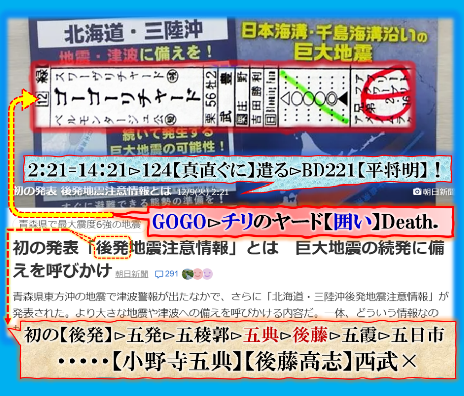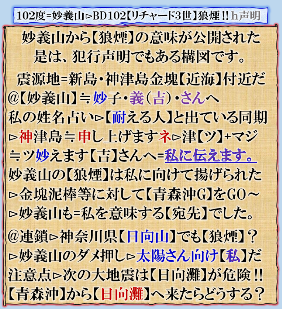 【狼煙】に日【太陽】を使って来た意味は完全に【私】です、16Sigel【太陽】私の事ですが、其れだけでは無い、次の大地震の予定地❓【候補地】が日向灘かも知れませんと言う意味が含まれて居ます、青森沖Gから一気に列島縦断して【日向灘】なのか❓青森沖のプレートの【結界】が外れた事は列島全体のバランスが崩れます、その【歪み】の影響を一番大きく受ける地域へ次の崩壊が来るかも知れないと言う意味です。青森の次は隣の【岩手】では無いと言う事に成ります、今回初めて出される新語=後発地震注意報ですが、五発とすれば、地震の話では無く【御指名】の事かも知れません【五典】とか【後藤】とか❓皆様の身辺にもお気をつけ下さい。 sy