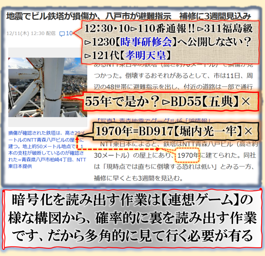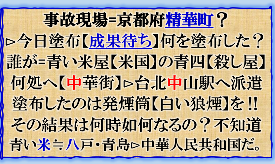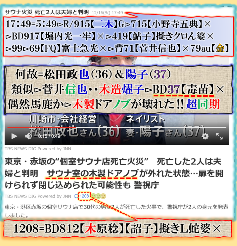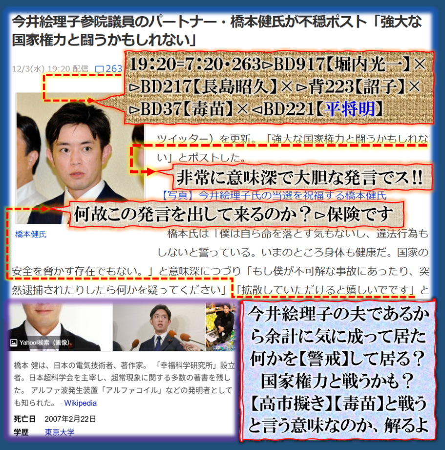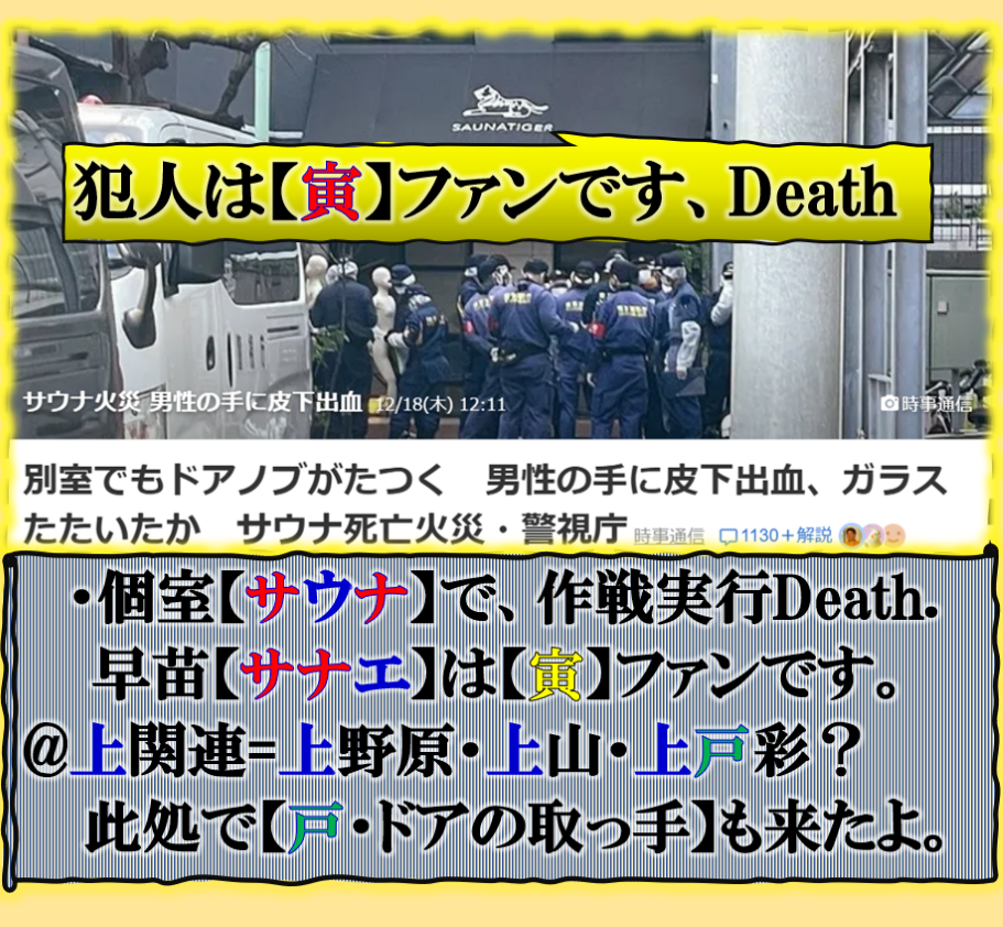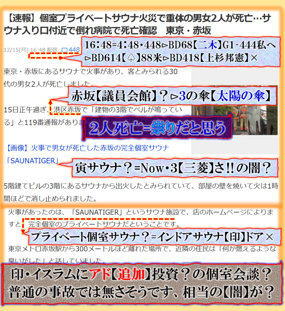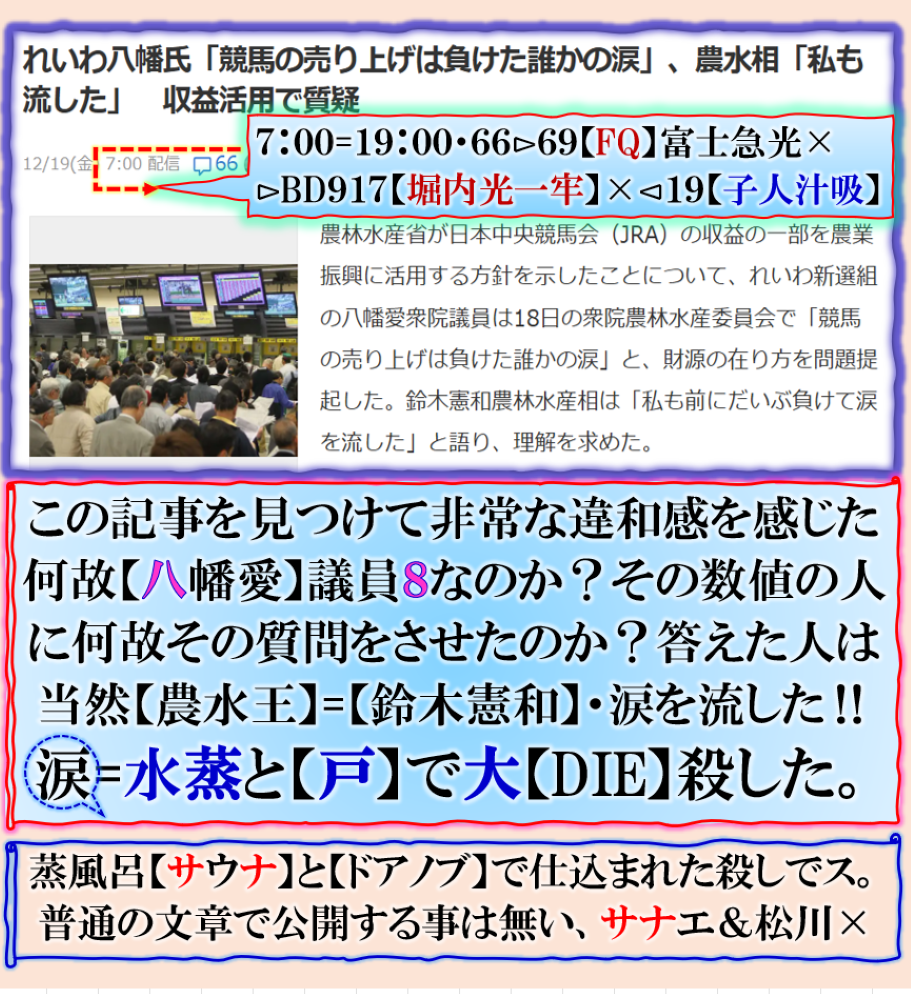 普通の文章で書けば簡単な事なのだが、絶対に是を書く訳には行かないだろう、だから「暗号化」で殺しを使って真実を公開して来た、その結果何が解るのか、殺しの本当の目的は【サナエ】と【松川】の闇をそれとなく公開して来た、【それ】とは一体何なのか❓此処で書くにも「躊躇」する内容だと思います、是以上は書けません。是は【号外】だから、相当にヤバいお話なのです。 sy
