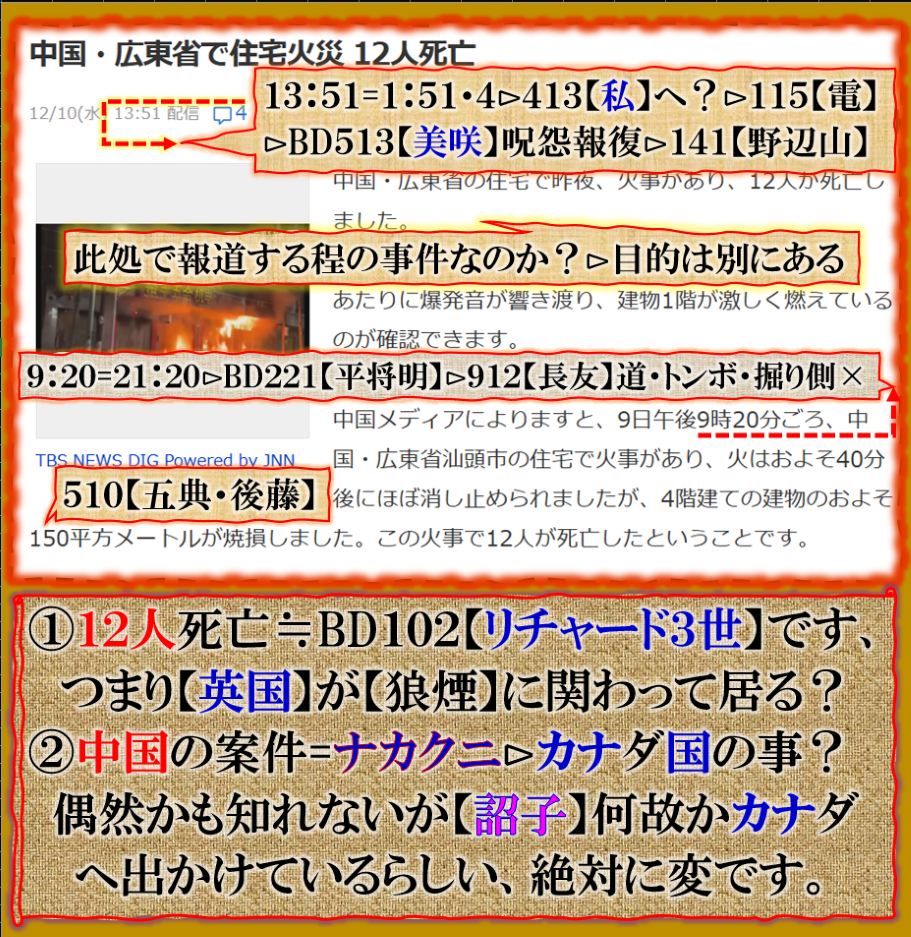 誰が見てもこの火事をトップでだすか❓変だろう、目的は別にあるから出して居る、12人死亡≒12の人を志望する≒BD12【リチャード3世】つまり英国が絡んで居る事から読み出す必要が或る、中国≒ナカクニの事なら【カナダ】と言う事に成る❓だから変なのです。 sy