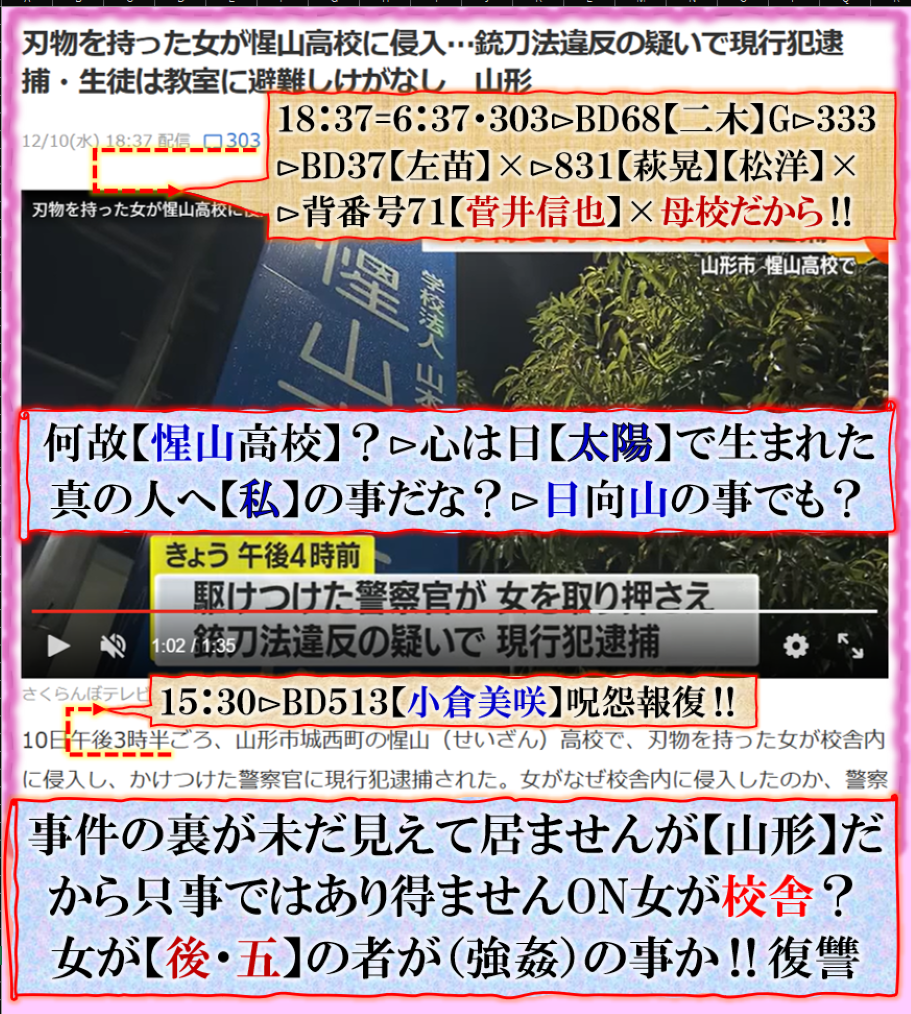 事件の真相は未だ良く見えて居ませんが【女】が刃物で高校へ入るか?⊳JK,の復讐劇⊳12月は【山鹿流陣太鼓】の音が聞こえて来るから、その気に成る人も出て来るでしょう、やる気なのです。 音波=超音波・電磁波等で人は操れますから、~~~♬ sy