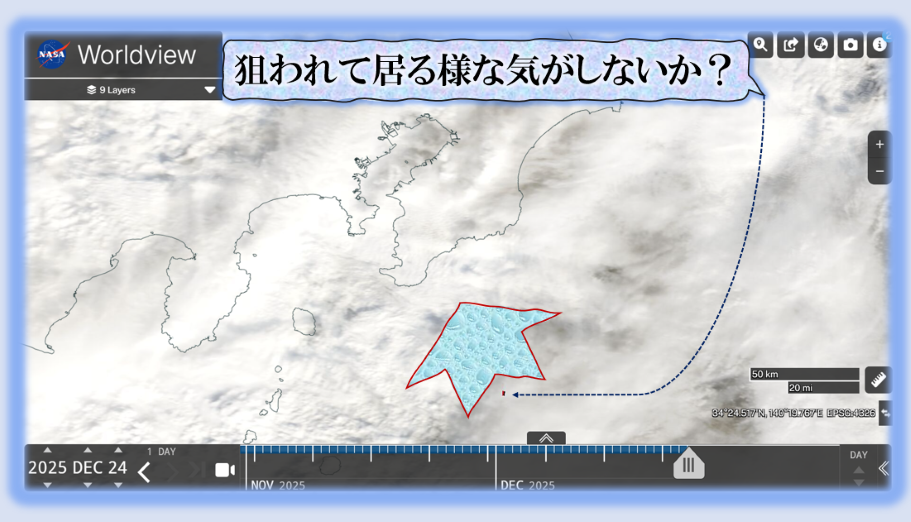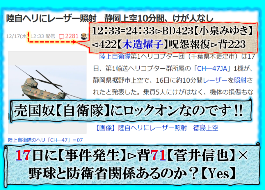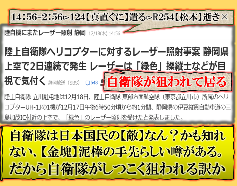 自衛隊機海外で狙われる理解出来るが、日本国内で狙われるのか❓だから変なのです、その本当の訳は其れらしいのです、本来の任務は日本国を国民を自衛する、攻撃は出来ないら自衛隊なのだが、奴等が自衛して居るのは国民では無くて【金泥棒】の自衛隊ンあって居ると言う人もいるのです、レーザー照射の意味が此処に【現象化】として出て来て居るのです。このままでは絶対にダメだろう。 sy
