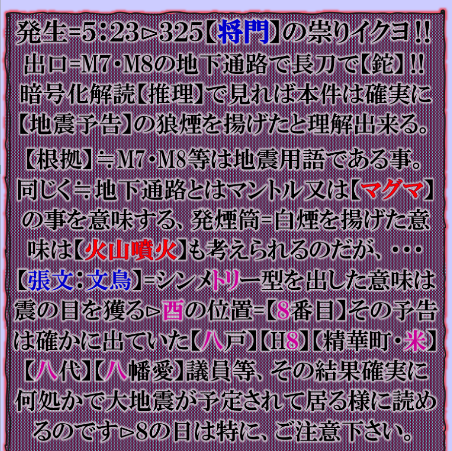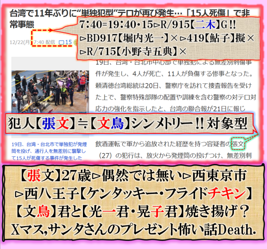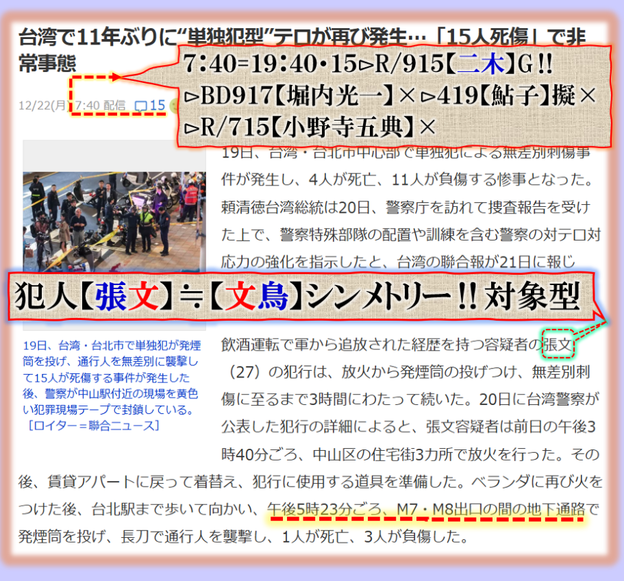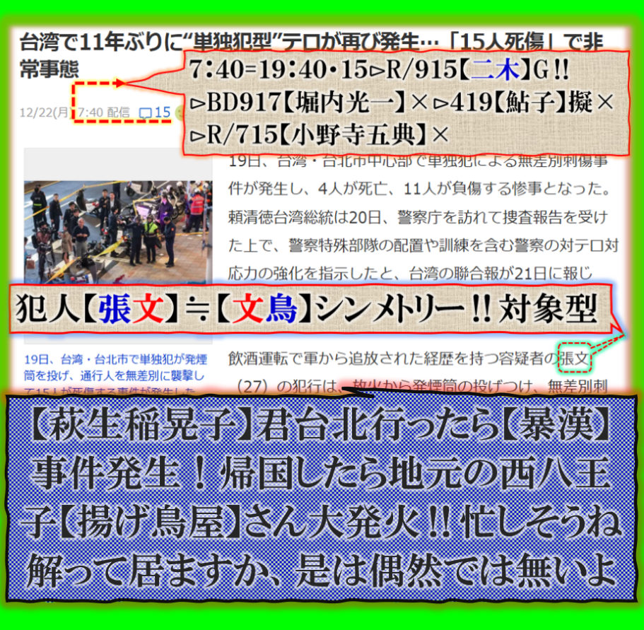 この事件の異常さは普通では無い、その裏を考えないと、犯人の名前が公開されて卒倒した=【張文:文鳥】と対称形【シンメトリー】型である事に驚き裏が見えて来ました。但し是は個人的な読みですから確実保障する訳では無い、可能性としてあり得る話だと言う事が理解できたという事です、結果は後から出て来ます、この事件が意味する物とは何なのか❓20年位前に台中地震が起きました、あの時は【中国軍】が東シナ海沿岸部に相当数量の【兵量】が集中して来た時に【中国軍】の侵攻を止める為に【台中】へ激震を撃ち込んだ、つまり敵の侵攻を止める為に自ら【自爆】させた訳です、流石に大地震で大混乱して居る【台中】に向けて進軍する事は出来ずに【作戦中止】させた訳です、地震兵器を抑止力に実戦使用したのです。今回は如何なる❓ sy