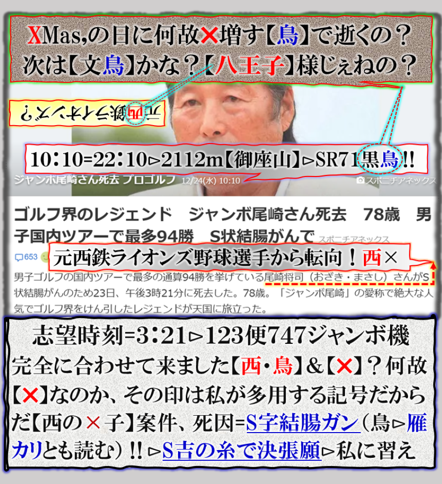 流石にレジェンド【ジャンボ尾崎】は唯では逝かないね、何処が普通では無いのか?何が【重要】なのか?考えて見てください。個人的には【死因】です=私の解読に従いなさい、と書いて無いか❓ sy