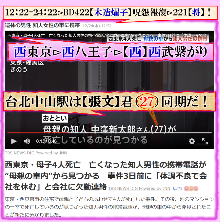 ジャンボ尾崎は【尾崎将司】将門の【祟り】の関連文字です、221は【平将明】つまりつながりが有る人が【平】君!‼西東京市の被害者は【中窪新太郎】=宇都宮市平出町の隣は峰町・中久保がああるならば此処で出て来た【太郎】君は【太郎平】様の事で或る、地元の人にしか通じませんが、・・・何故隠し文字で【平】を見せたのか❓八王子の親友に同じBD831【松本洋平】文科相がいる、其れを示唆している訳です、その【洋平】君も何やら相当危ない話に関わっている様子だと思われるのです、西東京市事件で何故【中窪新太郎】君を出して来たのか=確実に【私】へ向けたサインです=文科相【松本洋平】を間接的に出して来た、私は其れを見逃してはならない、だから此処で言及している訳です。全部【カルト系】の人達だと思います。 sy