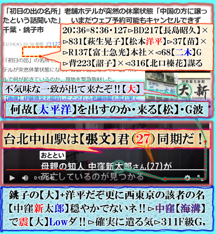 毎年1月は凄い事件が起きる様な印象が或るのは私だけじゃ無いだろう❓来年【馬年】は【太平洋】の窪地【日本海溝】に注意して下さいと言う『暗号化』によるメッセージだと理解出来るのです、皆様ご注意下さい【銚子】の意味は地理的に其れを出す為に必要だった、だから旅館の閉鎖の報道なのだが、実はそれもあるが本命は其処では無い、太平洋も広いから【銚子】辺りから見える範囲でやる気なのかも知れません米国西海岸やチリ沖は見えませんが無視出来ません、場所の限定は読めませんが、必ず遣る筈です。この答えは時間がだしてくれる筈です、Death.【中窪】が不気味です、駿河湾にも【深い窪地】がありますよね❓同じ太平洋だから無視出来ません。其れは間違いなく【祟り】で遣られる【現象化】であります、何処の誰が悪いのか迷惑千万です。 sy
