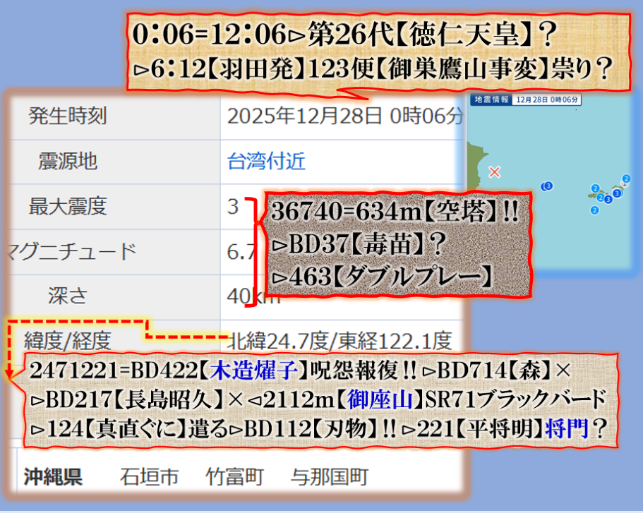 昨日野辺山へ行って来たいい天気でした、投稿済みの通りです、その数時間後【台湾沖】へ地震が飛んだ???とも言える、規模は小さいが転射成功???等と書くと問題が出ますが、時間的には理屈が合います。先日の台湾中山駅の暴漢【張文】君事件と言い何故かベクトルは【台湾方面】へ向いて居ます、この後何が起きるのか穏やかでは居られ無い、更に不気味さが増して来た蛇歳の最後のカウントダウン、更に、何が起きるか心配です、Death. sy