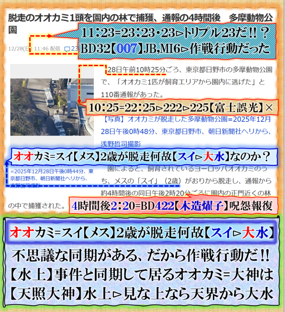 何故此処時期に【オオカミ】が脱走❓⊳水上にメス【執刀】したと言う犯行声明形式で公示して来た訳です、何故水上にメスを入れたのか❓⊳【御上】の何かに執刀した❓⊳水上の上は上高地の地下施設に対して【警告】!!‼!山を越えると【上杉蛮族】の地域だ其れが問題に成って来た、何故か【柏崎刈羽原発】全面再開とも同期して居る意味は、はっきり言って深く【政治的背景】がより深く関わって居る事が明白なのです、新潟【上杉】に今何が蠢いて居るのか❓穏やかでは無い局面に突入して来たのです。事件は東京都日野市の多摩動物公園内で起きた事件だが、是を暗号化読みで解析するならば=日野市=SUNの市・1=3の1=31日【大晦日】~1~3日に掛けて何か重大な事件が起きそうな匂いもする訳です、ご注意下さい、この冬場に上から水は無いだろう【雪」はあるかも知れないが、其れより【火】DEW,の方が怖い話だ、今現実に起きて居る【戦争中】の一コマである【現象化】として【オオカミ】の脱走なのです、お忘れなく、皆様の安全をお祈り致します。 sy