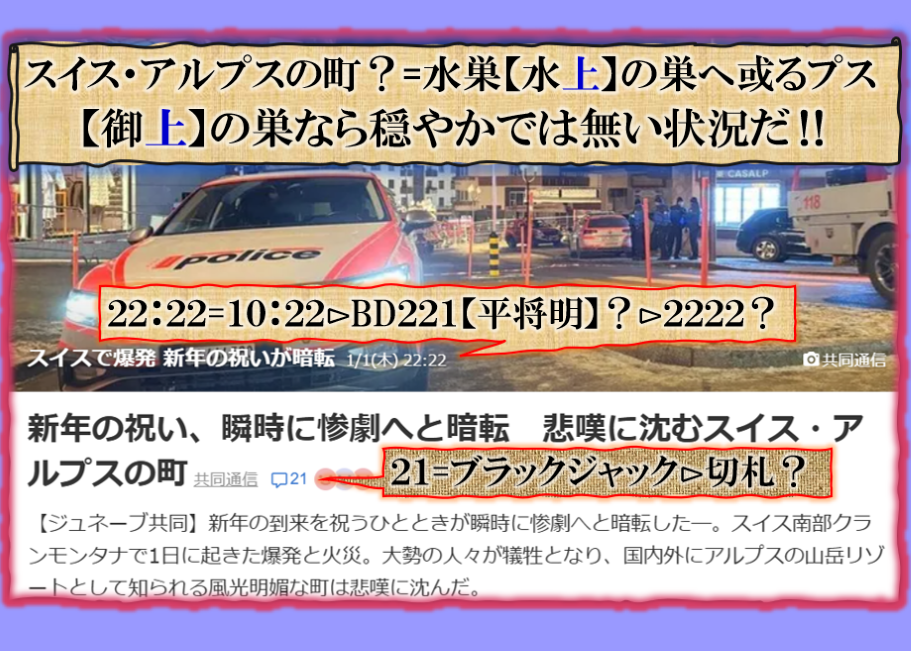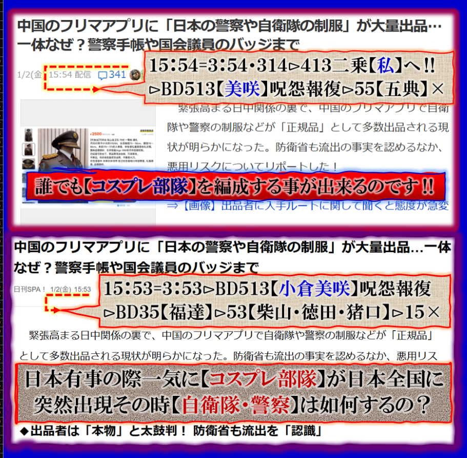 新年早々にこの報道が出て来た意味は全国民にこの事態を理解して下さい、速く国家の方向性を考え直して修正しなさい、と言う事を訴えて来た訳です、国民は【警察】と【自衛隊】を信用するな、と言う事なのです、でも奴等に国民は対抗する手段があるのか❓不可能です、だとすると人間技では対抗できない、奴等に【祟り】が見舞われる事に成る、当然その影響は一般国民にも及ぶ訳であり無念である、その他何か有利な対抗手段が無い物か各自でもお考え下さい。 sy
