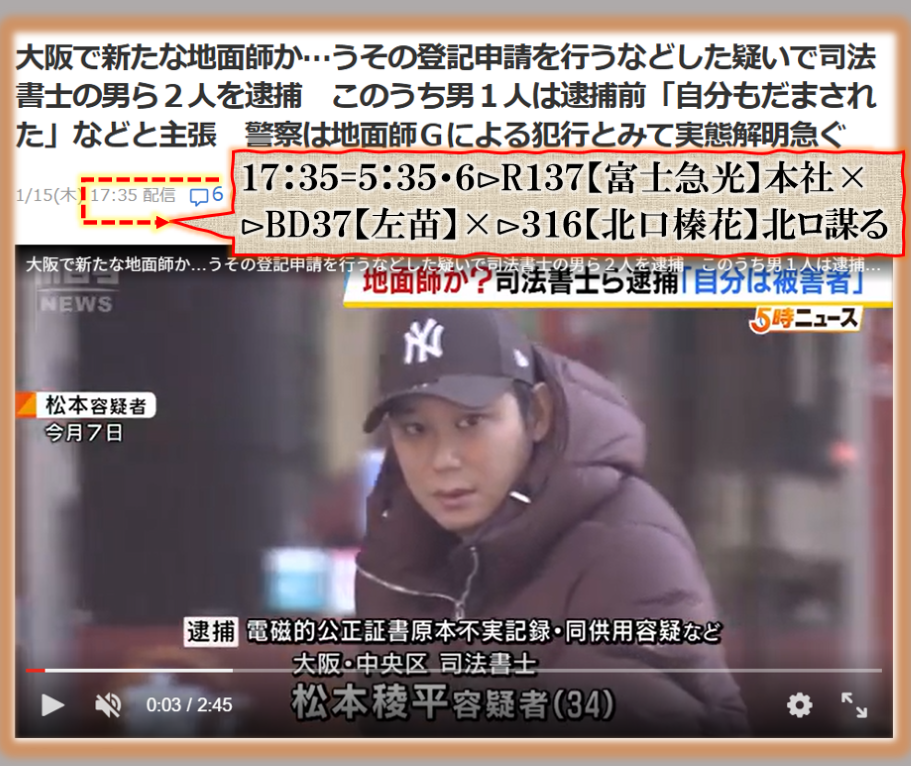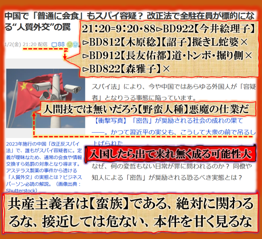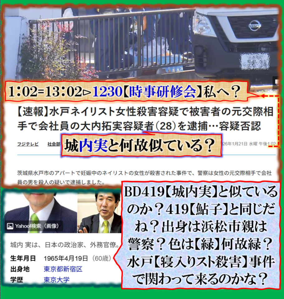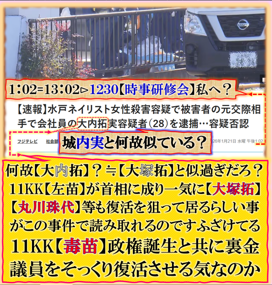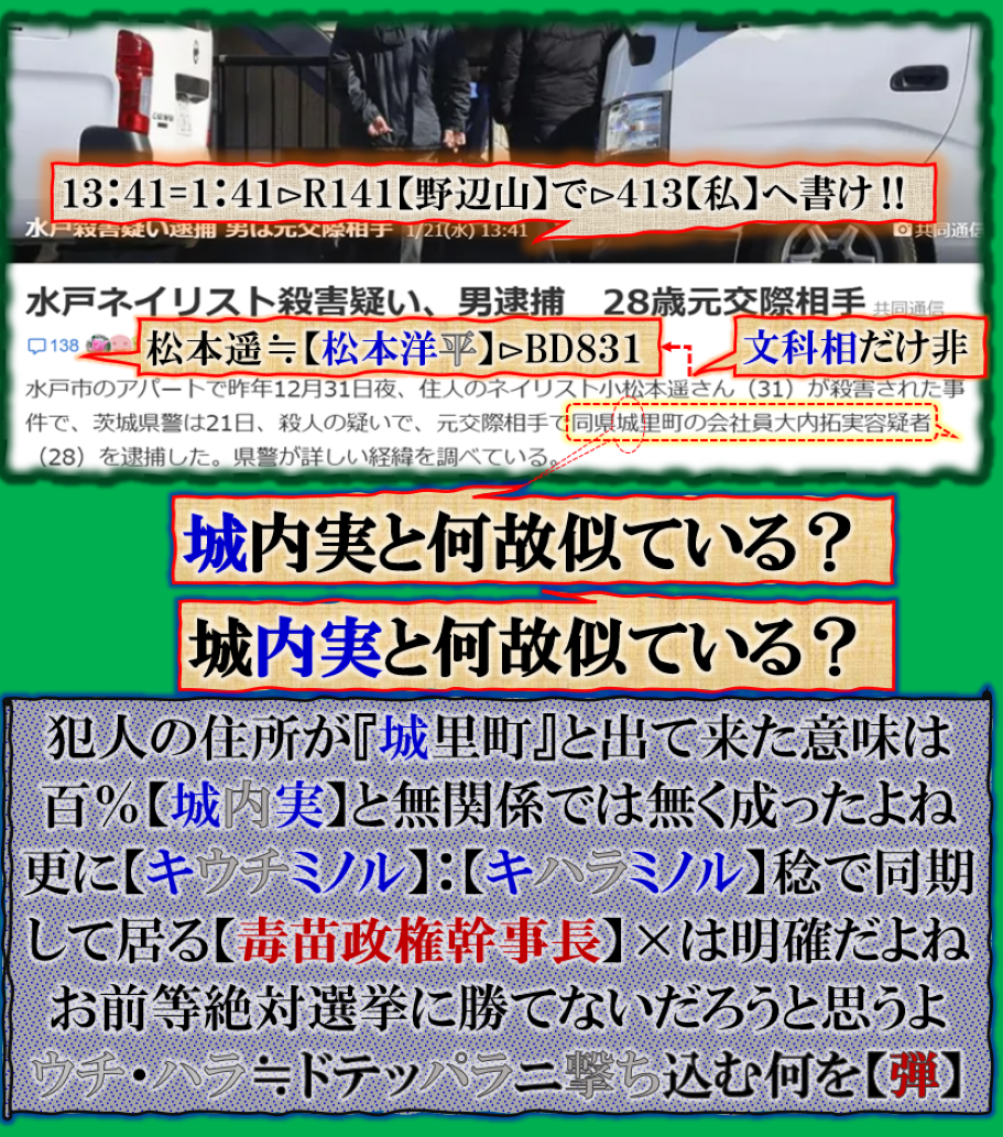 此処に登場する疑惑の人物は【松本】【菅井】【小泉】である、文科大臣・防衛大臣・野球選手❓是だけでも相当やばい【闇】を感じます、時間数値で出て来る【官房長官】‼【詔子】擬き蛇婆そしてFQグループの【松野】君皆様一筋縄では無さそうな人達ばかりです。是では真面な政治等出来る訳が無い【日本国】の奴隷化に成功した【中国人塩女スパイ】と関わる等と出て来た人も居るのだが、別セクトの人だから、その事案に対する【報復】で美人局報道【水戸】の【ネイリスト】事件で応戦した構図ですね、裏社会では毎日この様な【闘い】が繰り広げられて居る、その【闇】をバラされたくないなら、黙って見ぬふりをせよ!!!‼と言う攻防戦です、共に事件の裏は【女】です、是が政治の世界の日常なのです。本件を見て本当に事態を理解出来るのか普通の人には無理でしょう、でも事実なのです。 sy